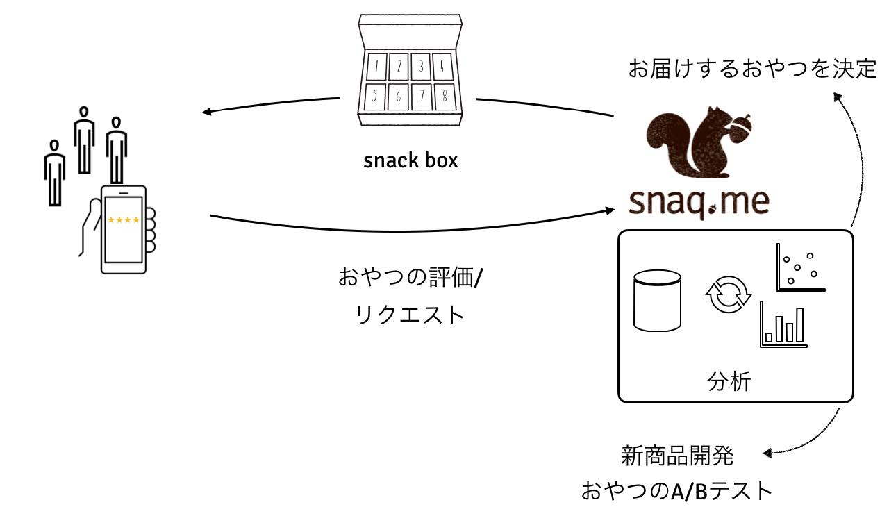 ユーザーは、はじめに約1分間のアンケートによる“おやつ診断”で好きなおやつの傾向を送信し、定期便を申し込む。届いたおやつの評価をマイページからフィードバックすることで、次のBOXの中身を自分好みに変えていくことができる。おやつの種類は現在100種類以上で、そのうちの10〜20%を毎月入れ替えており、組み合わせは約1000億通りにもなる。