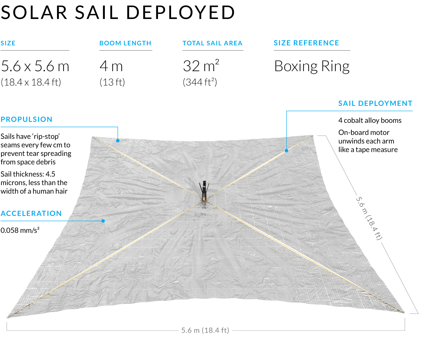 展開した太陽帆のサイズは5.6×5.6m、支柱の長さは46m、総面積は32平方6mで、ボクシングリングとほぼ同じ。推進材は数cm幅で碁盤の目状に糸を縫い付け、スペースデブリなどによる損傷が広がらないように対策している。帆の厚さは4.5ミクロンで、人間の髪の毛の幅よりも薄い。加速度は0.058ミリ毎秒毎秒。帆の展開方式は、4本のコバルト合金の支柱が巻き尺のように収納されていて、モーターによってそれぞれが伸びる(解説図提供:Planetary Society)