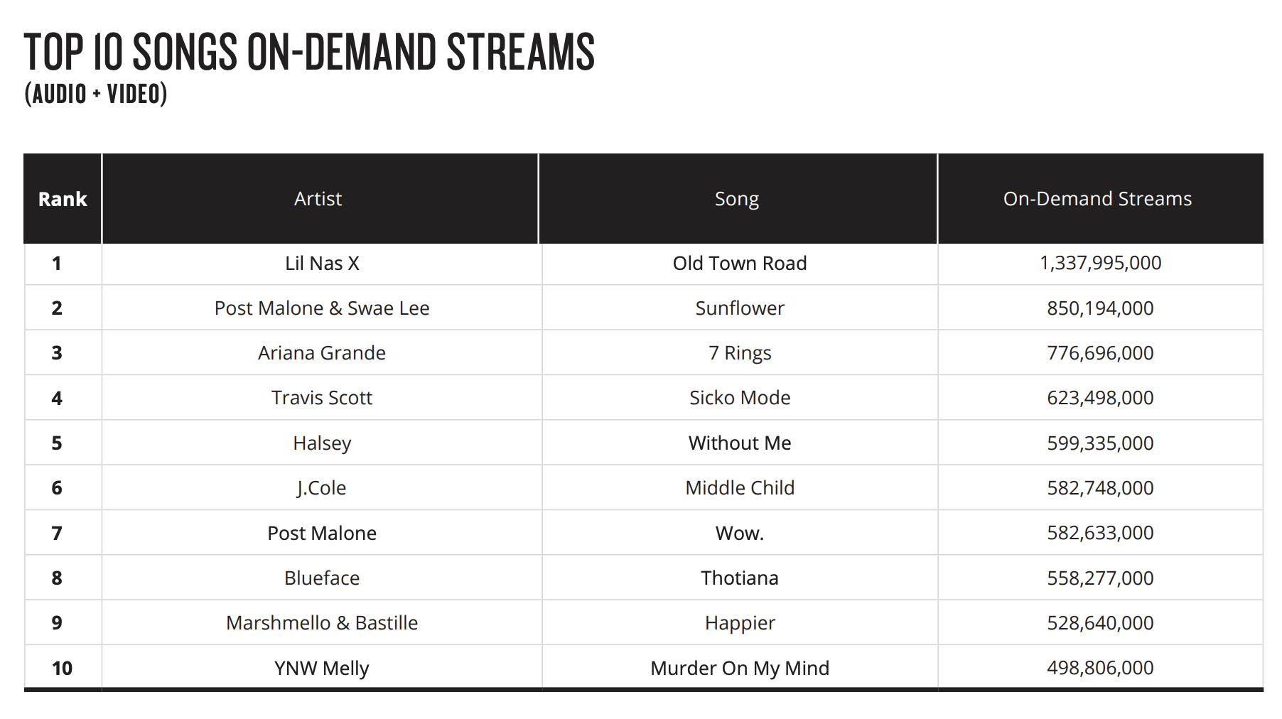 今週発表されたニールセンの中間音楽レポートによると、2019年上半期で史上最多となる5077億回のオンデマンド音楽ストリーミングがあった。昨年の上半期に比べ31.6%増となったこの記録的な数字は主に、Ariana Grande(アリアナ・グランデ)、Billie Eilish(ビリー・アイリッシュ)、Halsey(ホールジー)、Khalid(カリード)、BTS、Lil Nas X(リル・ナスX)、そしてBad Bunny(バッド・バニー)らのシングルやアルバムの成功に寄るところが大きい。