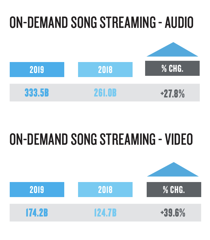 レポートはさらに、記録的な数字となった5077億回ものオンデマンドストリーミングを、SpotifyやApple Musicのようなオーディオストリーミングと、ビデオストリーミングに分け、急成長しているのはビデオストリーミングの方だということも明らかにしている。