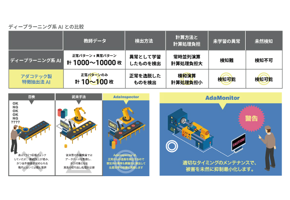 アダコテックでは産総研が開発した技術(高次局所自己相関特徴抽出法:HLACを用いた適応学習型認識方式)を軸に、従来よりも効率よく異常検知ができる仕組みをソフトウェアとして提供している。