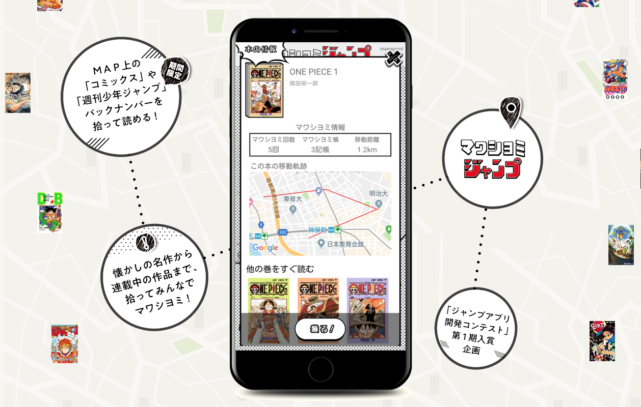 コンテストの第1期では、合計373件の企画応募があった。最優秀賞に輝いたのは、現実のマップ上でマンガを交換できる「マワシヨミジャンプ」。ミライアプリが企画したこのアプリは、ほかのユーザーが地図上に置いた電子版コミックスや「週刊少年ジャンプ」のバックナンバーを拾って読むことができ、置くことで再び誰かが拾うことができる。昔あった、電車の網棚に置き去りになっていたマンガ誌を拾い読みして、また次の誰かに置いていくといった体験を、スマートフォンと位置情報で再現したサービスだ。