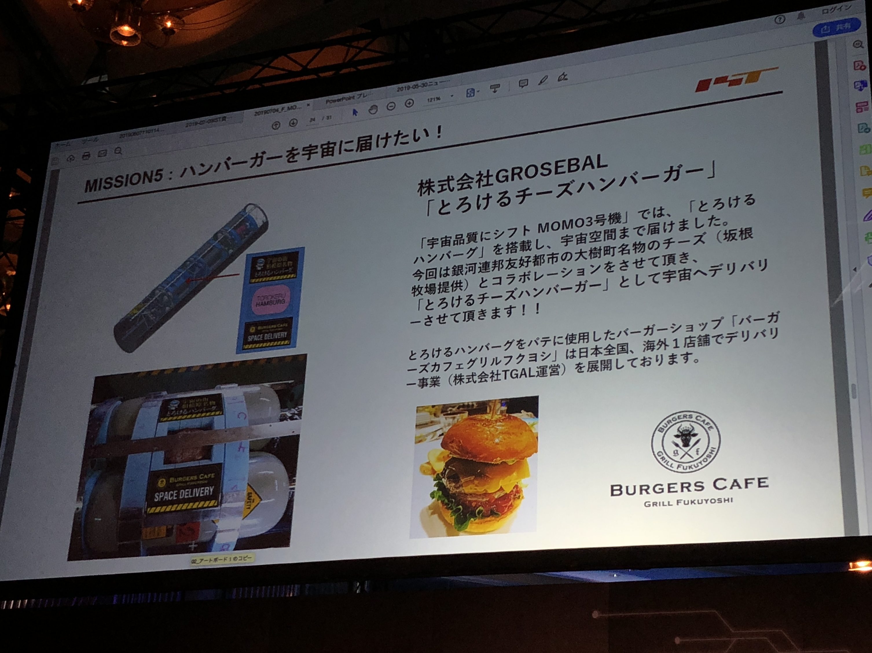 堀江氏はどのように資金を集めたかも語ってくれた。インターステラテクノロジズのロケットは100kgほどのペイロード(可搬重量)があるが、コーヒーやハンバーガーなどを載せて打ち上げるのだそうだ。ハンバーガーは250万円でロケットに載せる権利を売ったとのこと。「宇宙に行ったハンバーガーというだけで十分な宣伝効果になるじゃないですか」と堀江氏。確かに、数百万円で宇宙に持って行けるのであれば、宣伝費用としてはリーズナブルかもしれない。