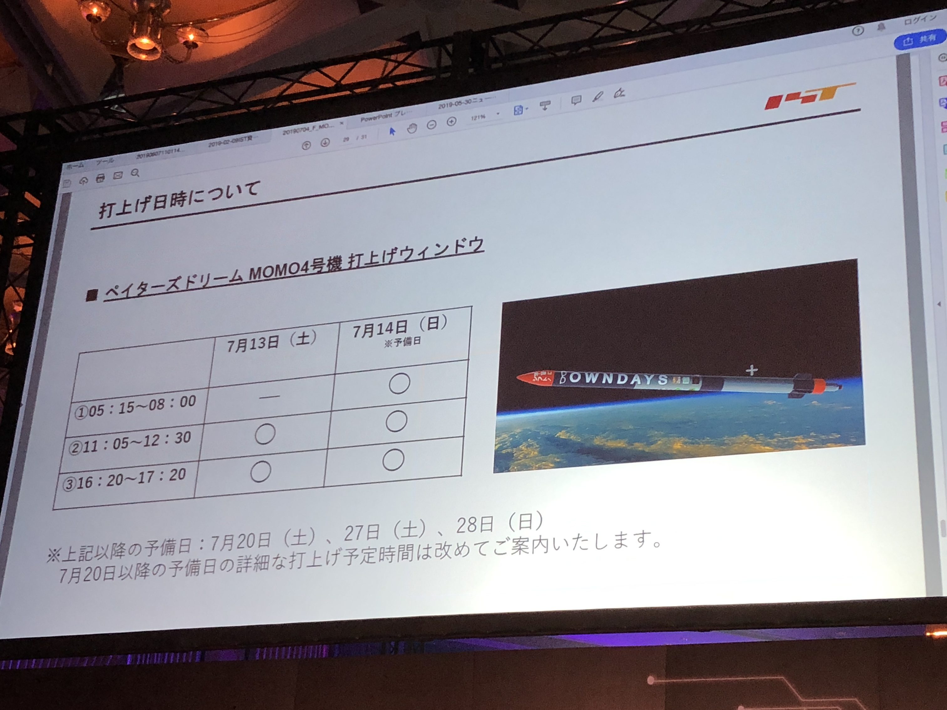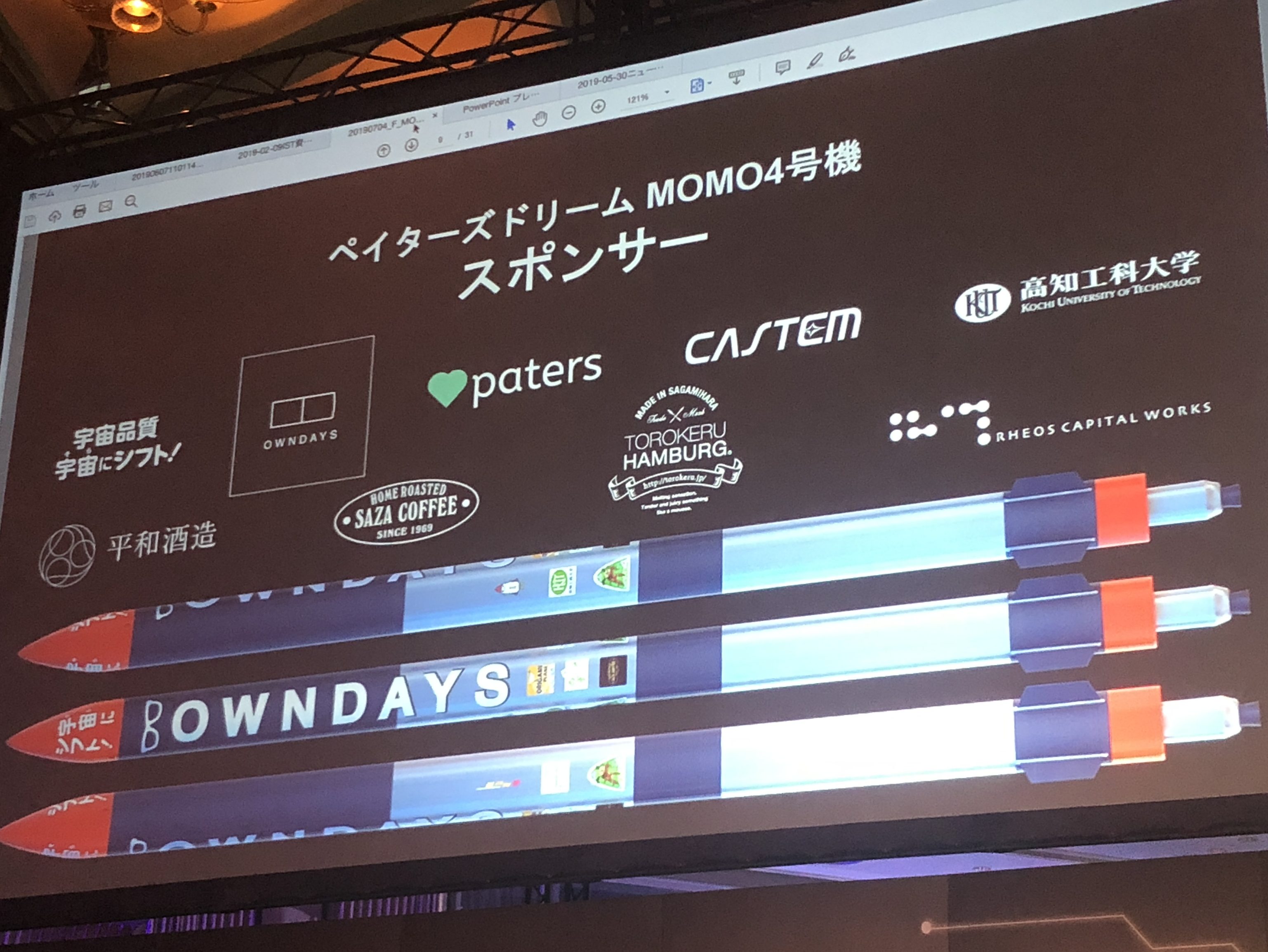 実はインターステラテクノロジズは7月13日にロケットの打ち上げを予定している(編集部注:天候不良のため延期)。この機体は「ペイターズドリームMOMO4号機」と名付けられており、ロケットとしては珍しく外装に広告が入っているのが特徴だ。ペイターズ(paters)とはオンラインラウンジアプリ、いわゆるパパ活アプリだ。そのほか、メガネのオンラインストアを運営するOWNDAYS(オンデーズ)、平和酒造といったさまざなスポンサーのロゴが機体にペイントされる。これらも堀江氏のアイデアだ。