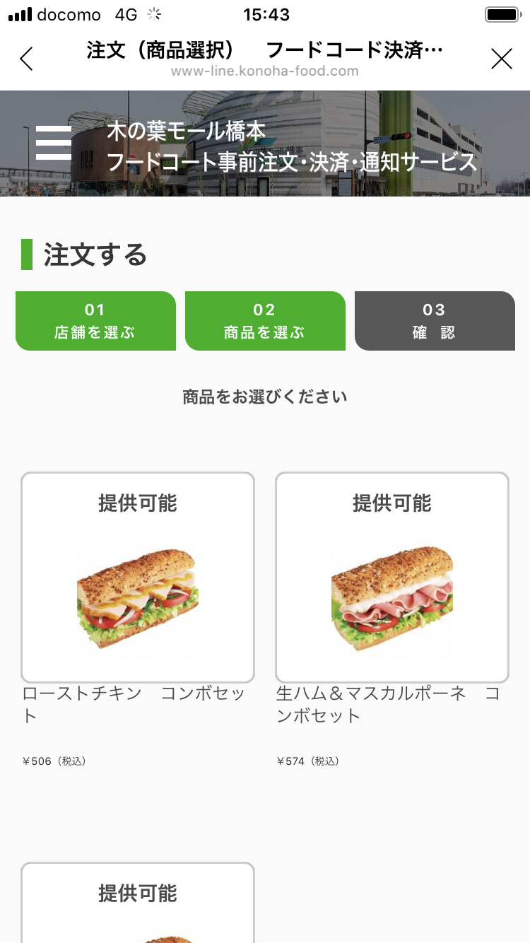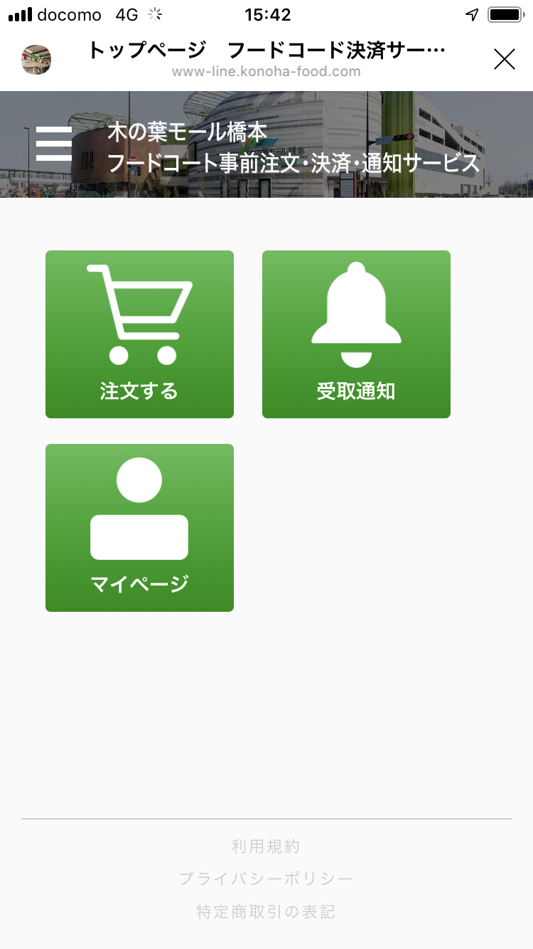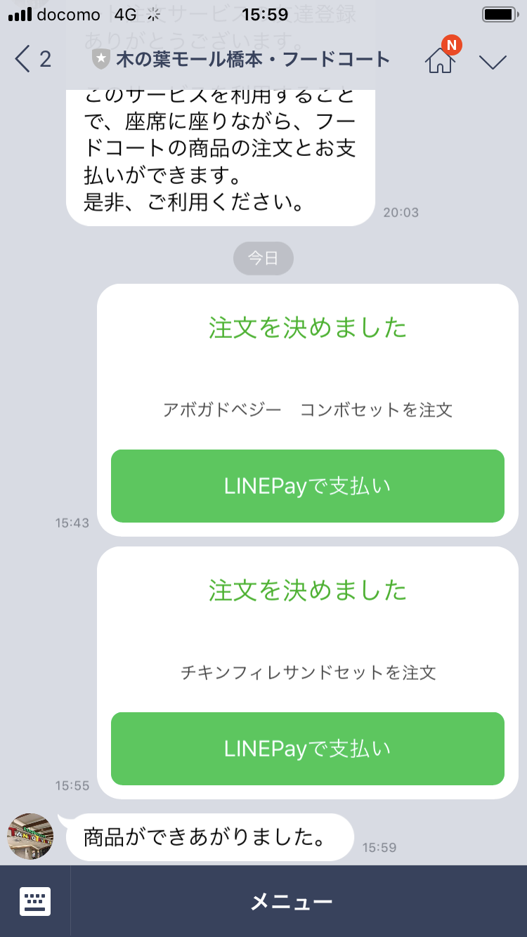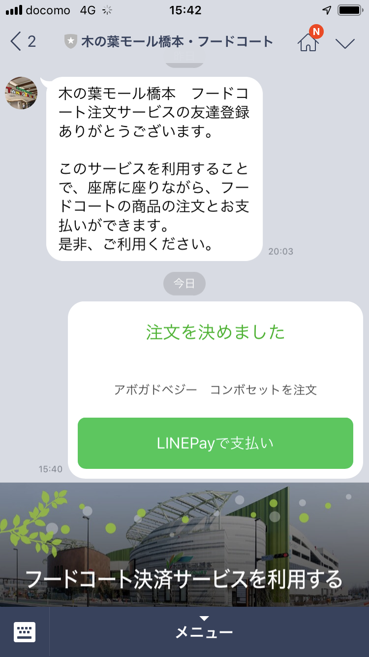 モバイルオーダーの方法は簡単で、木の葉モール橋本の公式アカウントを友だち登録してモバイルオーダーのメニューを選んで指示に従って操作するだけ。