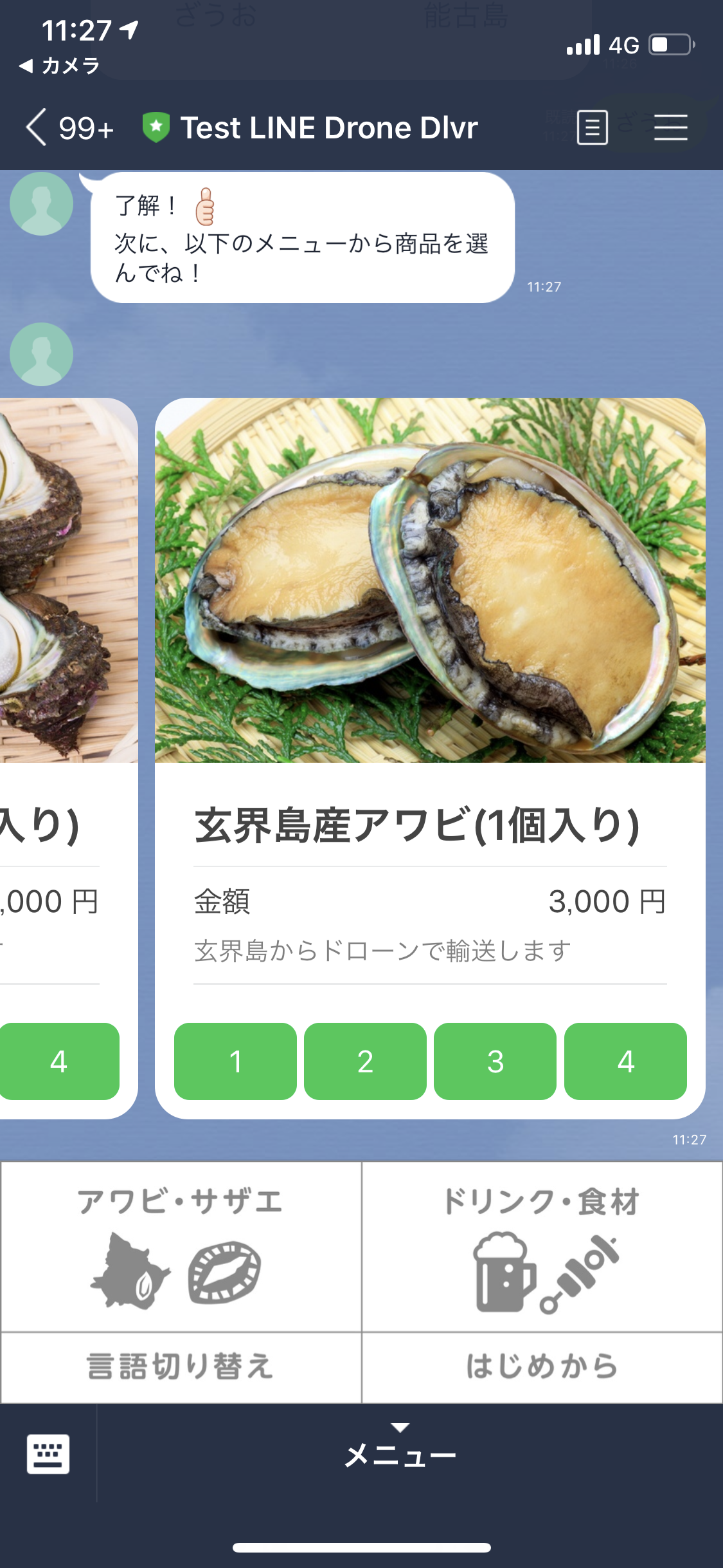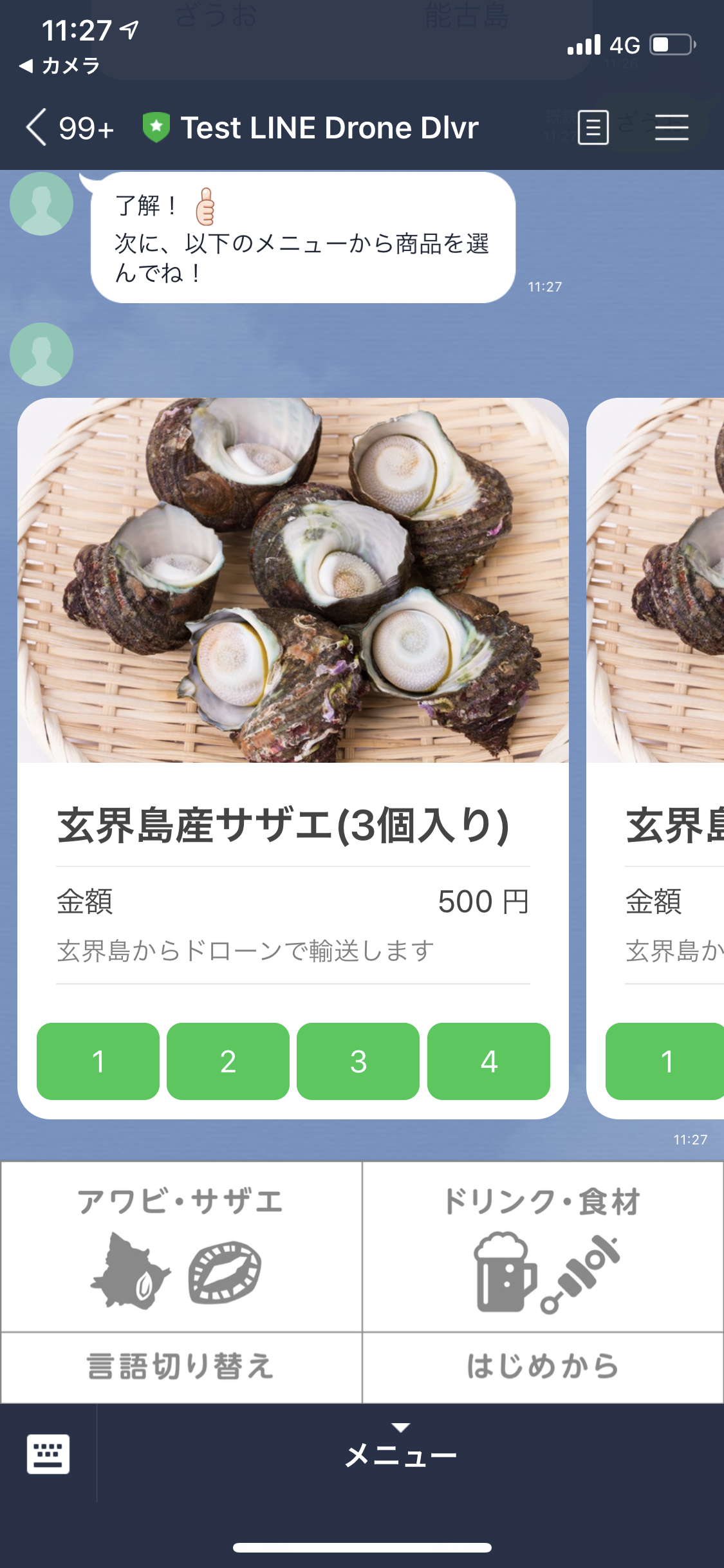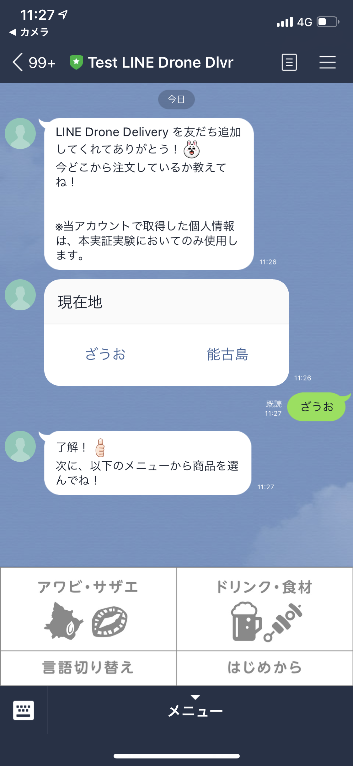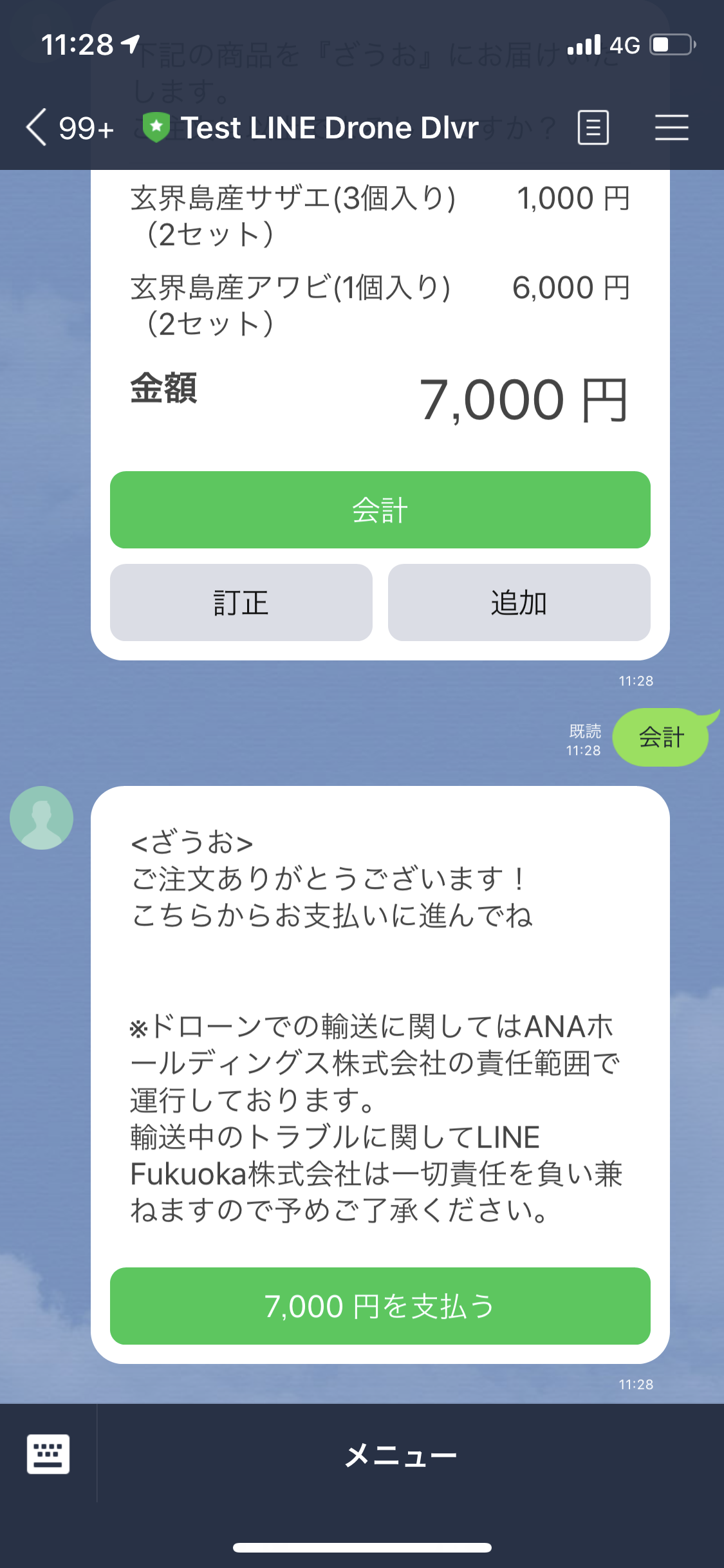 LINE Fukuokaでは、LINEアプリ内に実装したモバイルオーダー機能を提供。BBQ会場でスマートフォンから海産物をオーダーすることで、そのオーダーが玄界島に届き、海産物がドローンで運ばれてくるという流れだ。