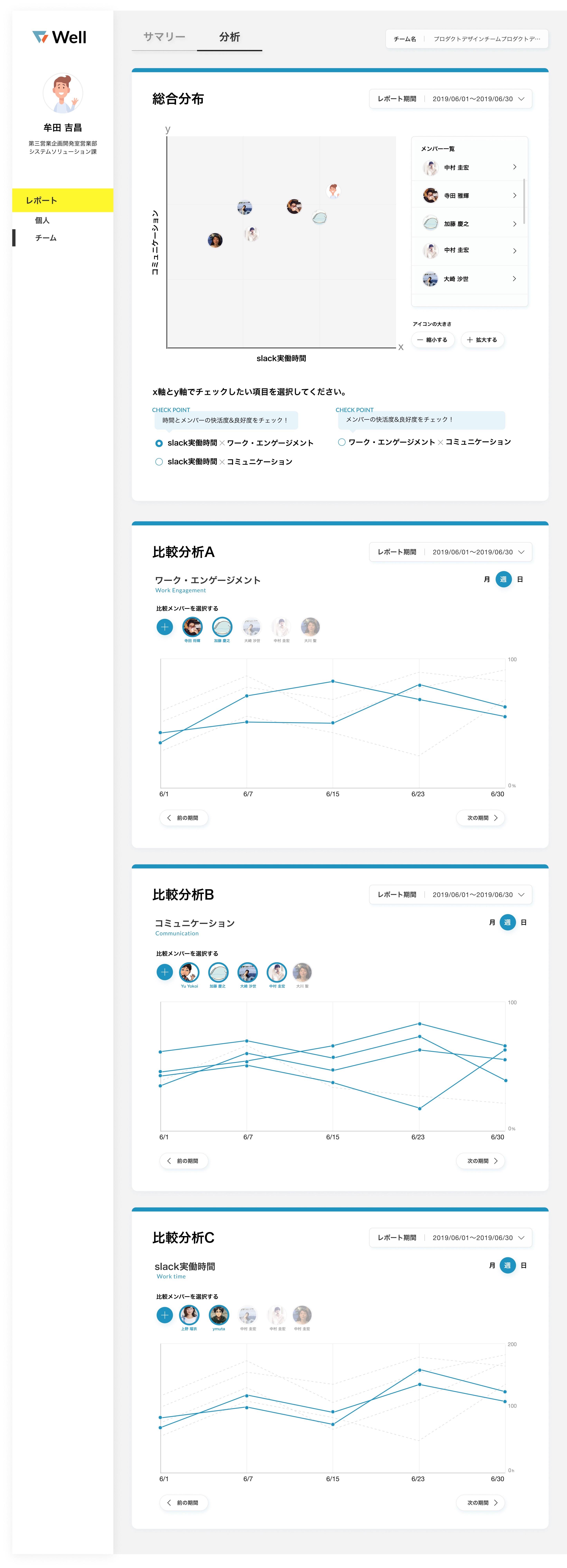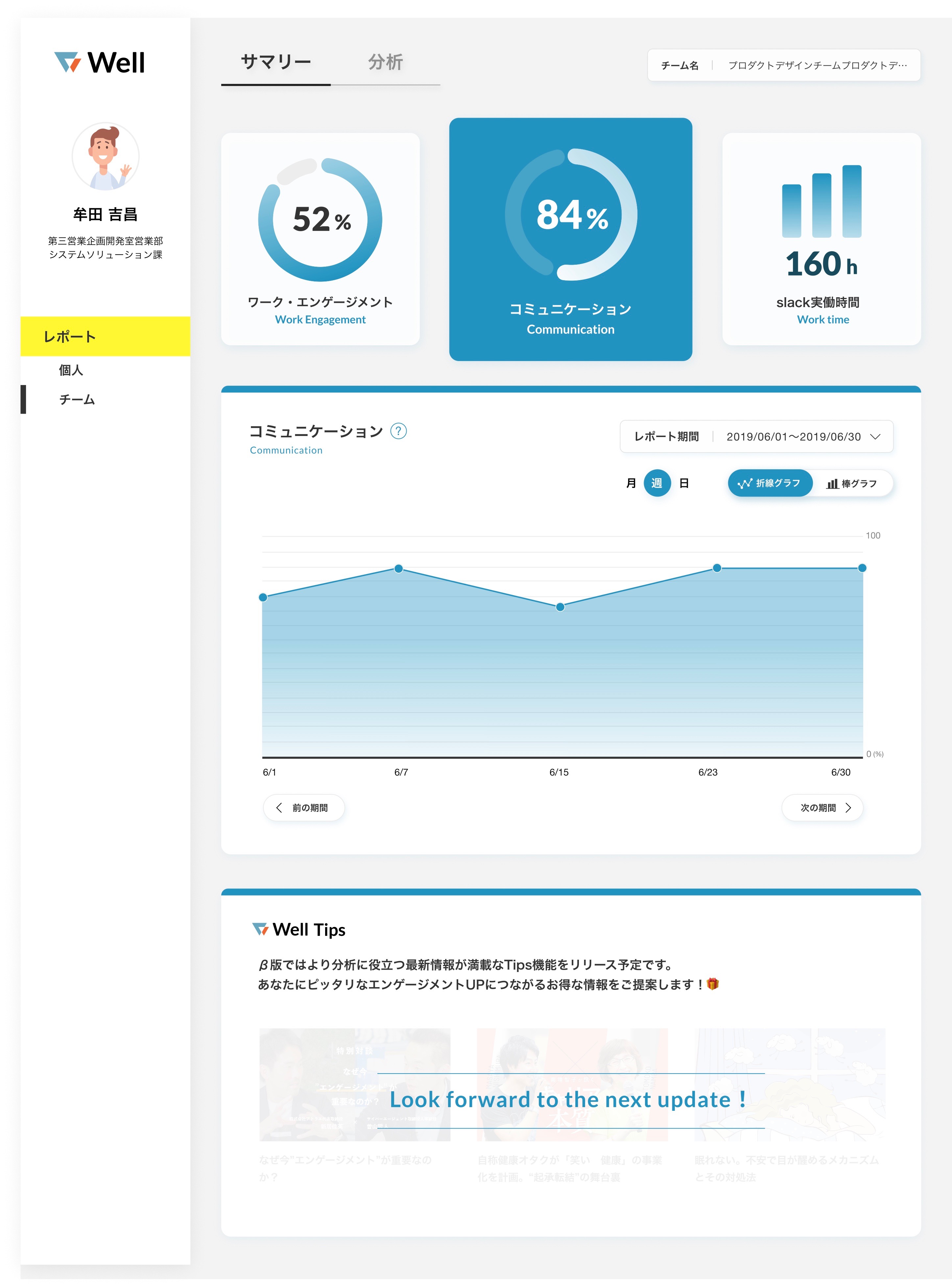 現段階ではα版のWellは、Slackなどのコミュニケーションツール上で従業員の行動データを取得、AIで解析し、個人および組織のコンディションを可視化することができるツールだ。