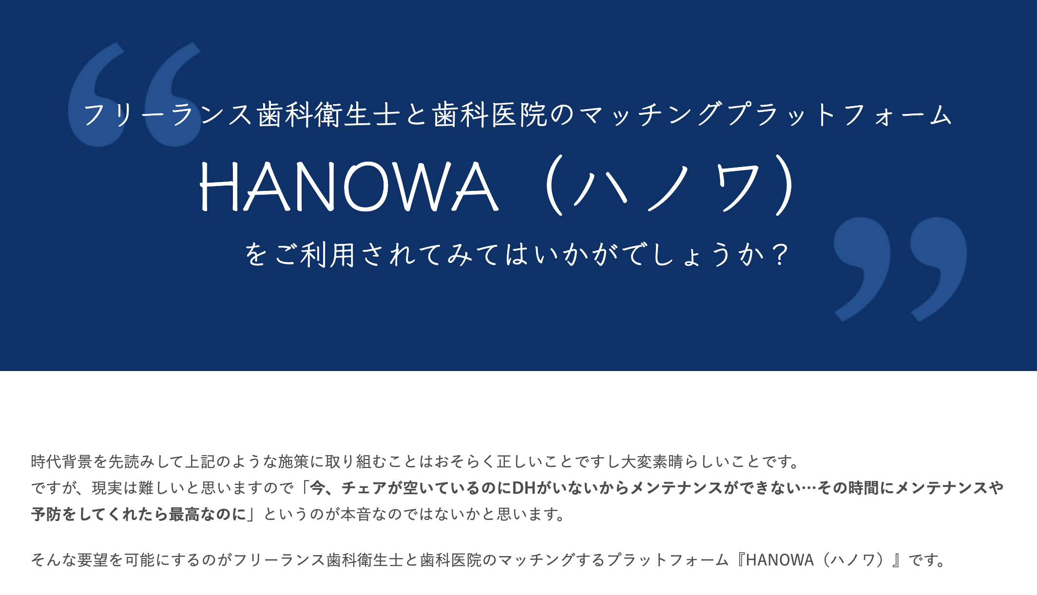 フリーランスの歯科衛生士と歯科医院のマッチングプラットフォーム「HANOWA」を運営。現在、全国的に歯科衛生士の数は不足しているが、実は有資格者(国家資格)の約半分以上は潜在労働力として働いていない。これは女性の歯科衛生士が、出産などを機に休職することが多いうえ、子育てと仕事を両立できる歯科医院が少ないという現状がある。HANOWAでは、歯科衛生士のすきま時間をシェアリングし、複数の歯科医院でパラレルキャリアの就労を可能にする。人材のマッチングだけでなく、医科衛生士と歯科医院の相互レビュー機能も備える。
