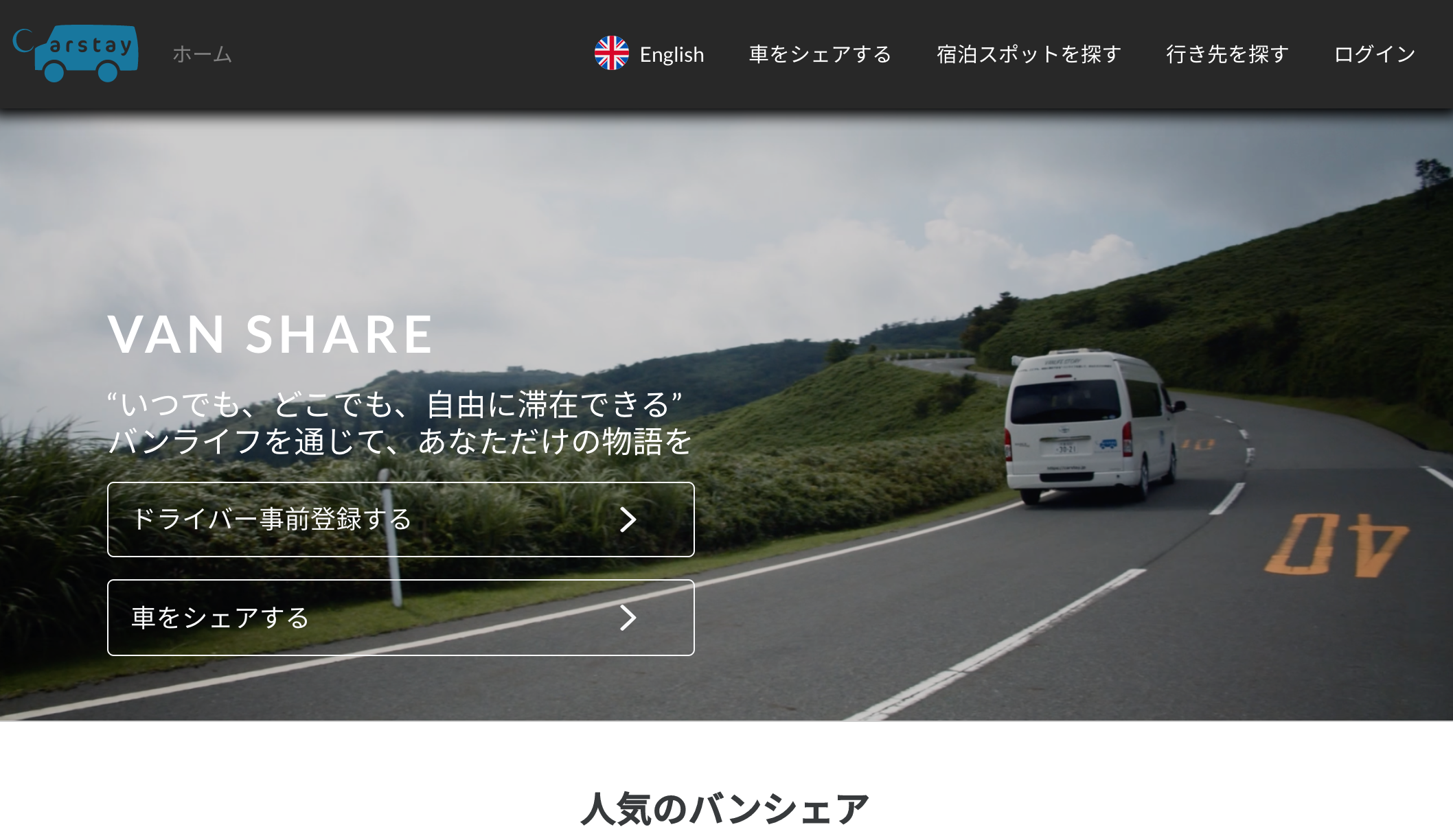 車中泊可能なバンのシェアリングサービス「VAN SHARE」、車中泊スポットのシェアリングサービス「Carstay」、ライフスタイルメディア「VANLIFE JAPAN」を運営。VAN SHAREでは、バンを借りる人である「ドライバー」とバンをシェアする「ホルダー」の両方に自動車保険が自動付保される。鍵の受け渡しは対面なので、車体に特別な装置を装着する必要もない。シェアできるバンは、大人1名以上が快適に車中泊できる自動車のみ。もちろん、キャンピングカーなどの特殊用途自動車も登録可能だ。