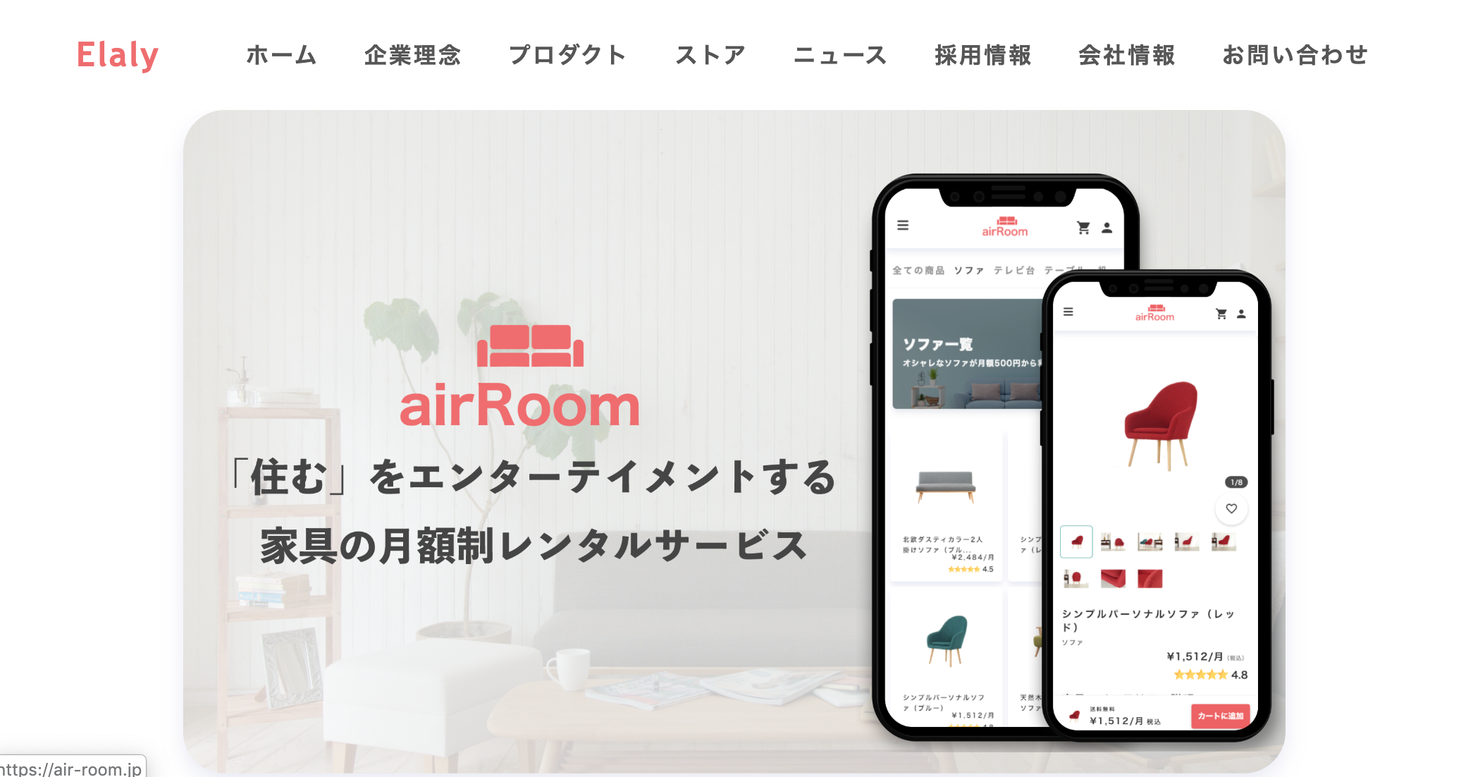 取り扱い1万品目のインテリア家具を月額定額で利用できるサービス「airRoom」を運営。利用者は月額500円から借りることができ、もちろん1カ月単位での家具の入れ替えも可能。高い料金のものでも月5000円程度とのこと。プロのインテリアコーディネーターによるコーディネート提案や配送料、返却料、組立、設置なども無料だ。補償サービスも付帯しており、家具に傷をつけても追加料金を支払う必要はない。今後はハイエンドの家具のラインアップを増やしていく。