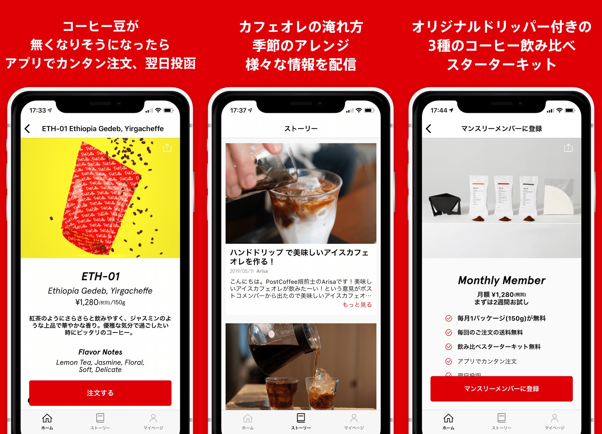 豆が無くなりそうなタイミングに合わせて「アプリからワンタップ」で注文できるのが特徴。最短で翌日ポストに投函されるので不在時でも心配はない。個別で購入することもできるが1280円からの月額会員になると送料が無料になるほか、登録後に3種のコーヒーを飲み比べられるスターターキットを無料で試せる。