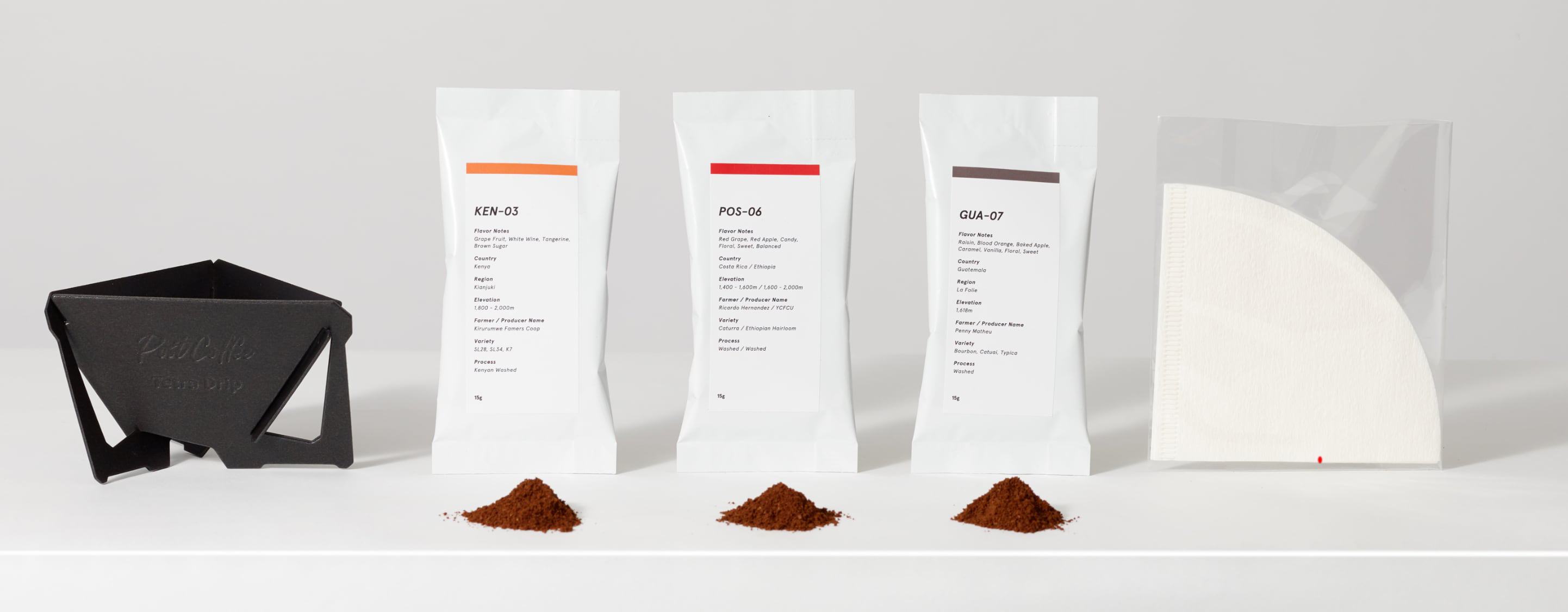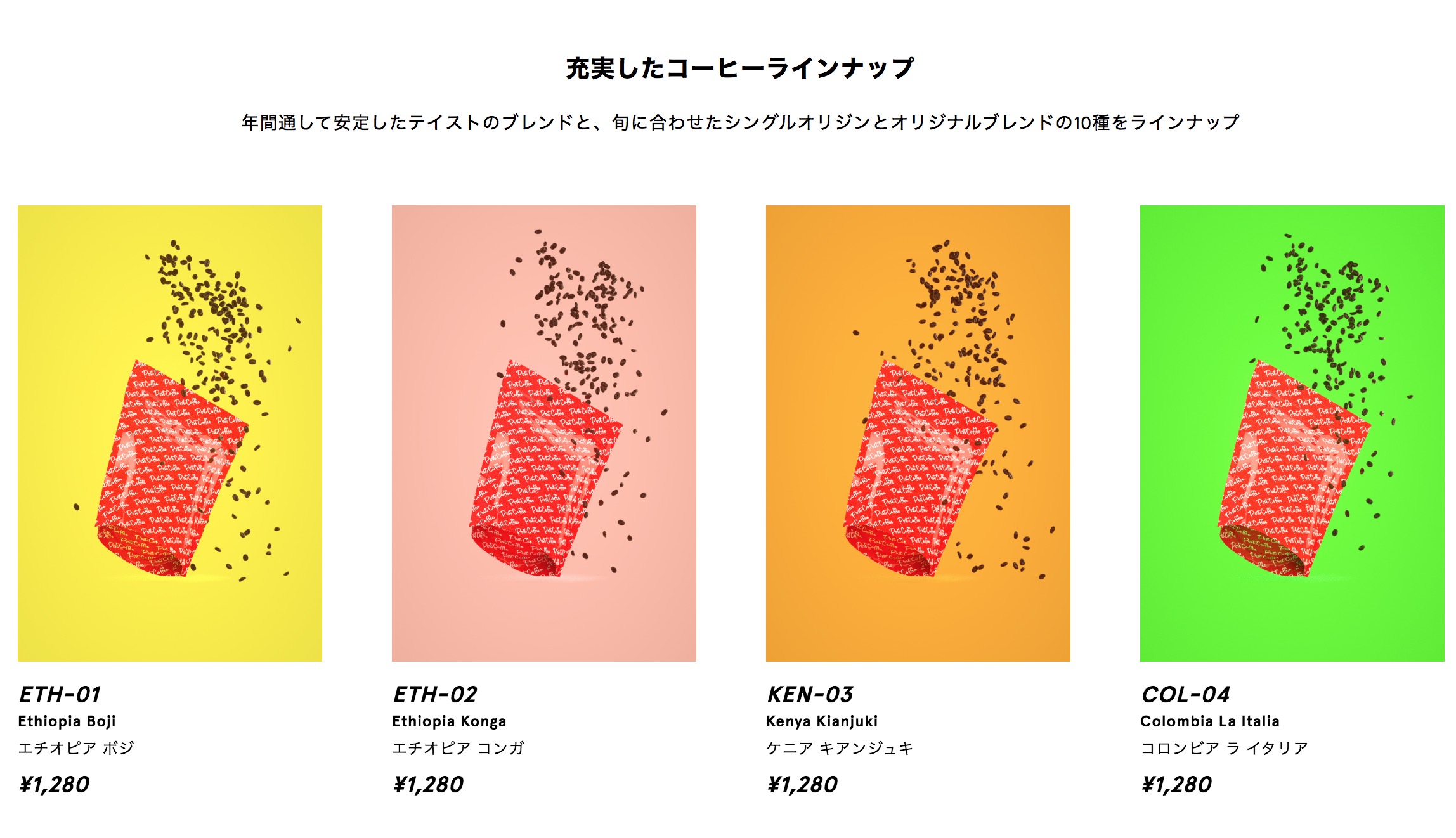 各パッケージは約10杯分に相当する150gで一律1280円。ユーザーは注文時に豆のままか挽いたものかを選ぶ。
