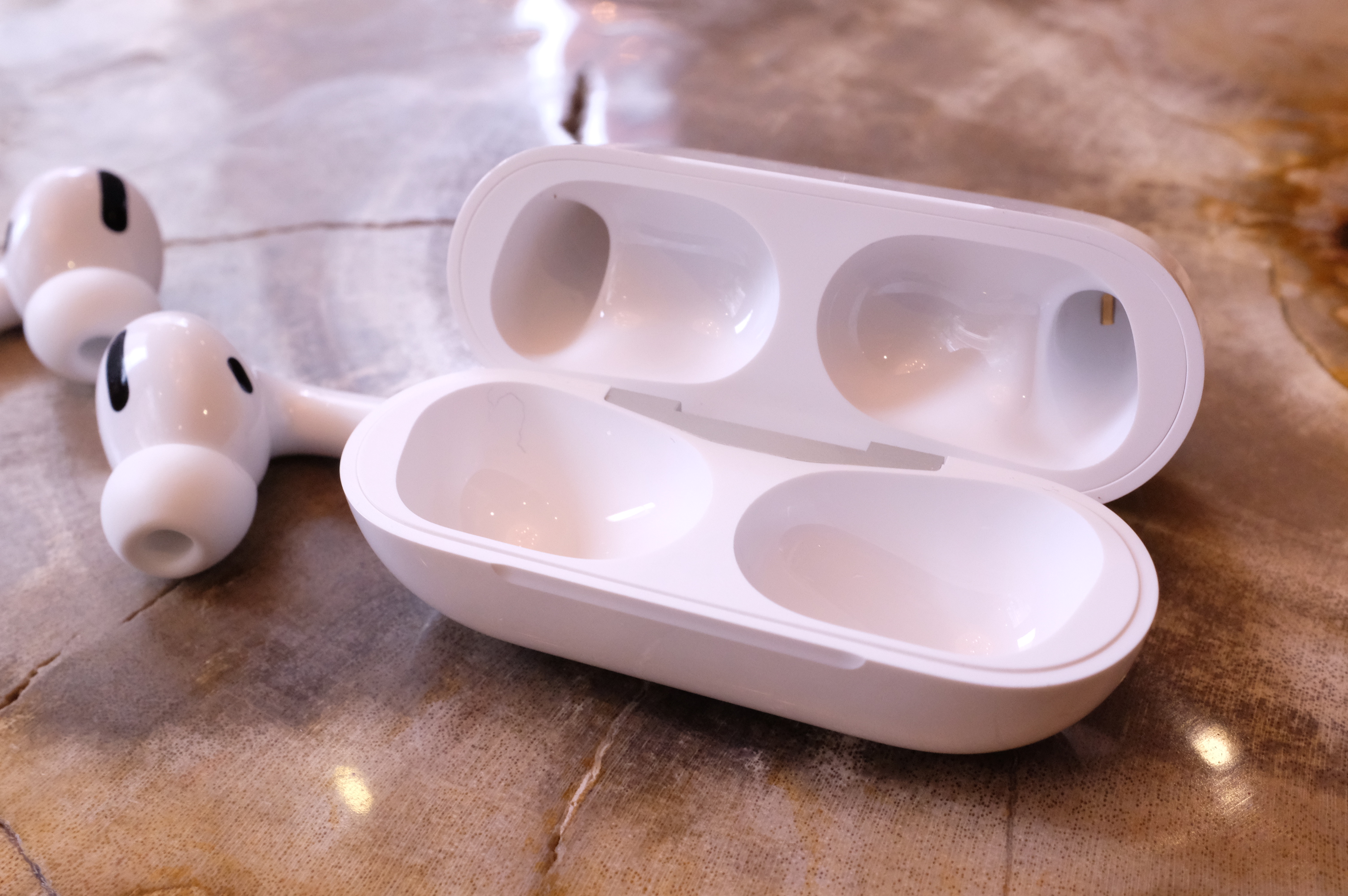 ノイズキャンセリングも、外部音取り込みモードも、同様にバッテリーの持続時間をじゃっかん短くする。それらがオフの状態では5時間連続再生できるところが、オンでは30分ほど短くなる。充電ケースを利用した場合、ノイキャンも外部音取り込みもオフの状態なら、Appleは24時間使えるとしている。来週初めに飛行機でアジアに行く際には、これを限界まで試してみようと、今からワクワクしている。快適さについてもテストしたい。今日も、今のところ数時間使っているが、すべて良好だ。