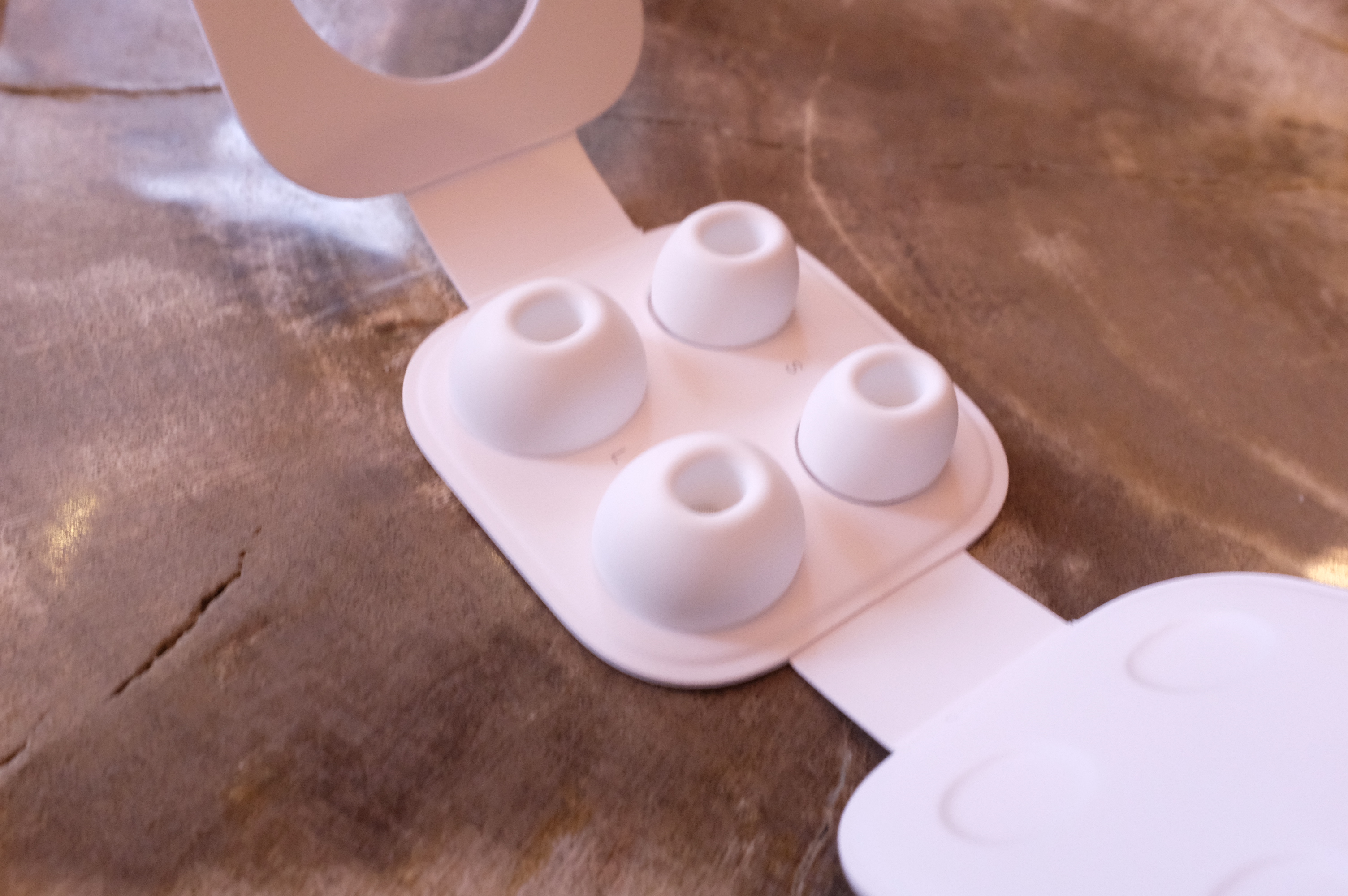 なぜ、これまでずっとアップルは、イヤーチップの採用を見送ってきたのか。私には理解できないが、同社もようやく自らの判断で採用を決めたのだ。AirPods Proには、スモール、ミディアム、ラージという3種類のイヤーチップが2個ずつ、合計6個付属している。購入時にはミディアムが装着されている。しかし、これらは標準的な形状のシリコンチップではない。それでも強く引っ張れば外れる。イヤホン本体と噛み合う部分は固くなっている。