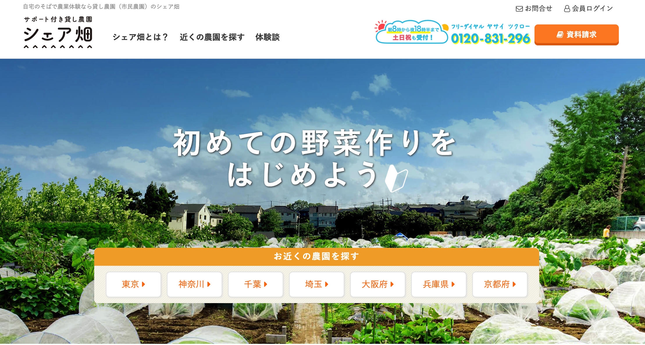 シェア畑は、現在首都圏を中心に93カ所で運営。現地に種や苗、肥料、農機具、資材などがすべてそろっており、手ぶらで訪れて野菜作りを体験できるのが特徴だ。菜園アドバイザーから野菜作りについてのレクチャーを受けられるので、素人でも専用区画で年間30種類以上の無農薬栽培の野菜を収穫できるとのこと。