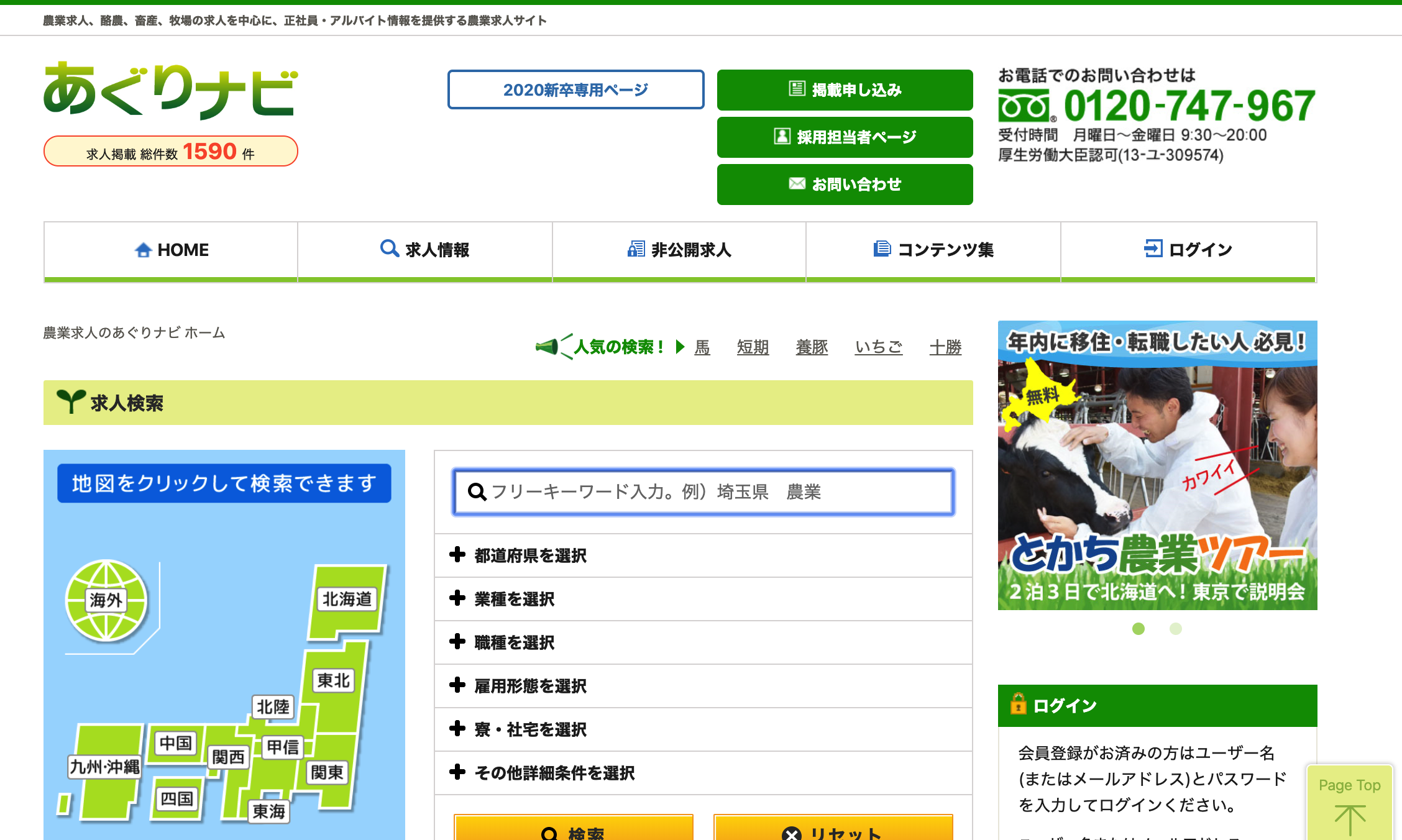 あぐりナビは、農業、酪農、牧場を中心とした求人サイト。就農希望者には希望者はキャリアアドバイザーのサポートが受けられるのが特徴だ。サービス開始5年で登累計録会員が5万人を突破しており、取引農家は北海道から九州まで計4200件を超えている(2019年9月時点)。会員のうち30代以下が約7割で、実際に新規雇用就農者(農家に従業員として勤務する人)の約4分の1が「あぐりナビ」経由で就農しているそうだ。さらに、農業への外国人の受け入れをサポートするサービスも展開している。