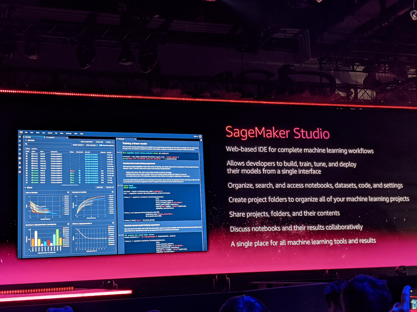AWSのCEOであるAndy Jassy(アンディ・ジェシー)氏は米国時間12月3日、re:InventカンファレンスでSageMaker Studioを発表した。機械学習ワークフローを構築し、トレーニングするためのウェブベースのIDEだ。データサイエンティストが仕事を始めるために必要なものすべて、つまりノートブック、データセット、コード、モデルなどを編成するための手段が含まれている。とにかく始めるために必要な、すべての機械学習ツールと成果のワンストップ・ショップになることを目指したもの。
