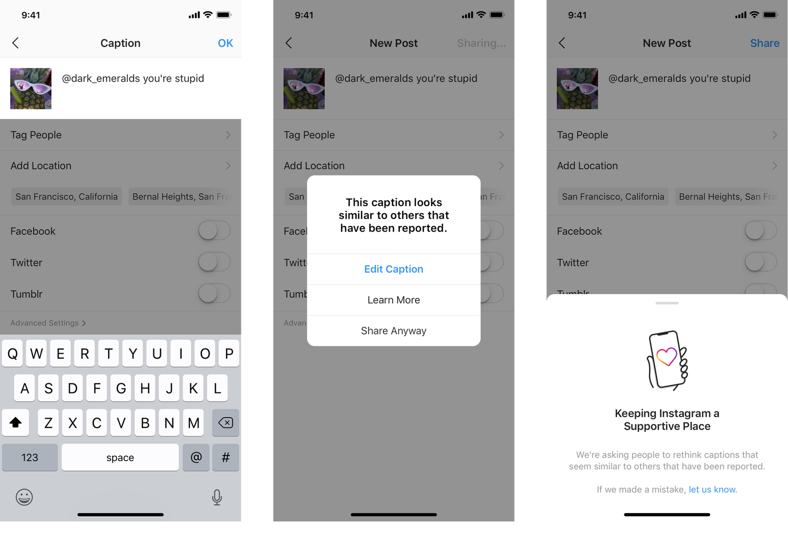 この新機能が実装されると、ユーザーが悪質と思われるキャプションを書いた場合に「このキャプションは以前に報告されたものと類似しているようです」と通知が表示される。この通知を見たユーザーは、文言を編集するか、ボタンを押して詳しい情報を見るか、無視して投稿することができる。