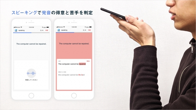 同アプリには、選択問題や自由入力、ディクテーションなどの機能が備わっており、リーディング、ライティング、リスニングの英語学習に重要な4技能中の3技能を強化することができたが、今回新たにスピーキング機能を搭載したことで、利用者に最適化された問題を解きながら全技能を学習できるようになる。