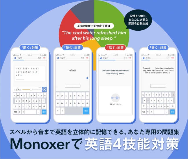 モノグサは12月23日、記憶定着アプリ「Monoxer」にスピーキング力を強化するための新機能を搭載した。既存機能と組み合わせることで、英語4技能を1つにまとめて効率的に学習できる。