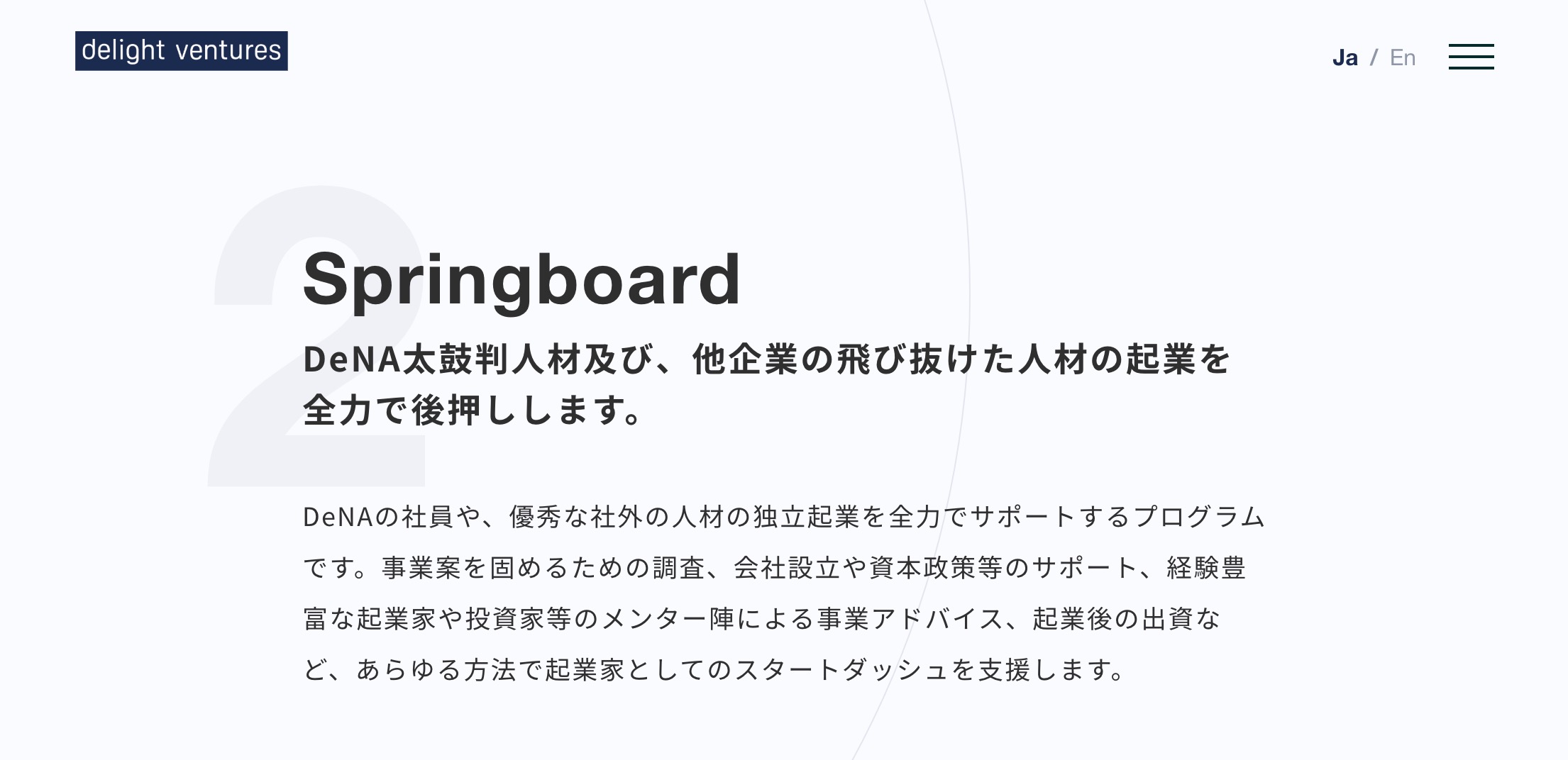 ちなみにデライトベンチャーズでは以前から「Springboard」という名称で、主にDeNAの社員を対象に事業案へのアドバイスや会社設立・資本政策などをサポートする取り組みを行ってきた。
