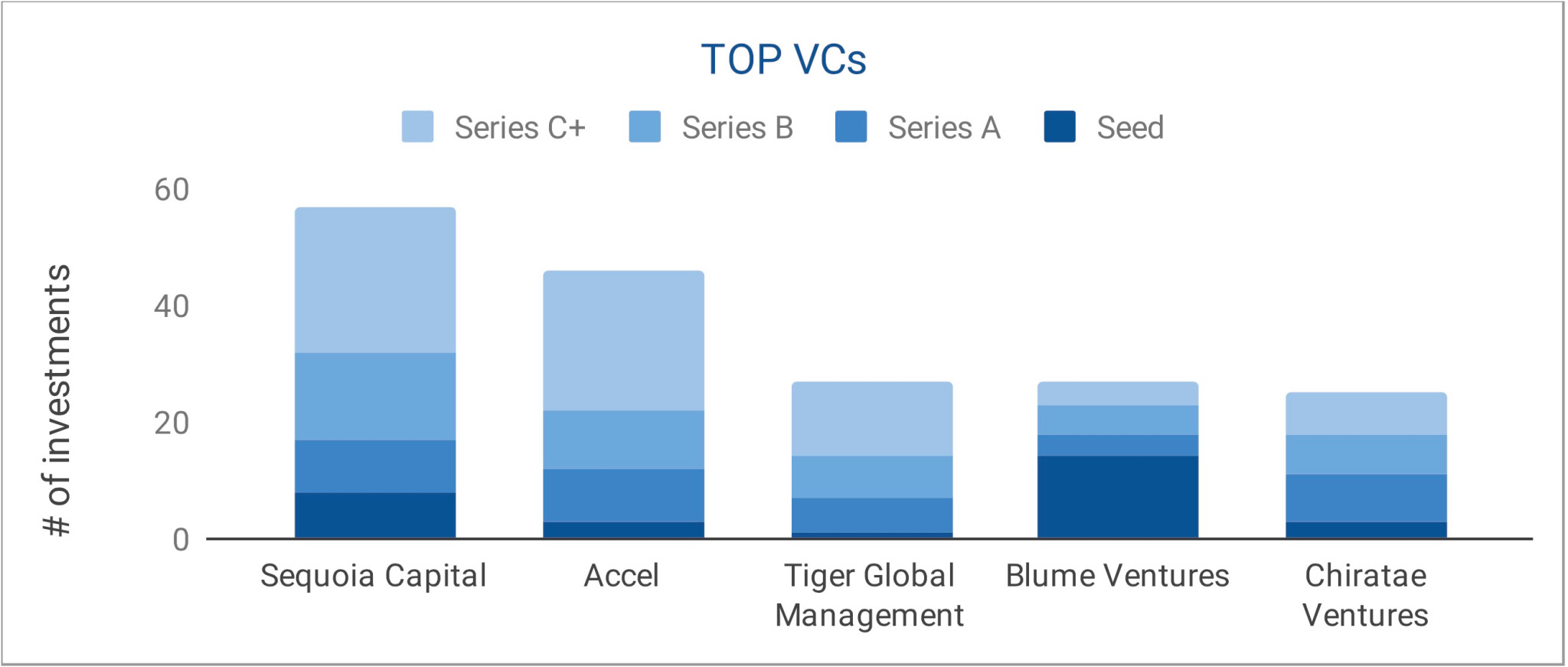 50を超える投資(または共同投資)があるSequoia Capital(セコイアキャピタル)は、インドのテックスタートアップにとって今年最も活発なベンチャーキャピタルファンドだった。Googleのインドと東南アジアビジネス担当の元幹部、Rajan Anandan(ラジャン・アナンダン)氏は4月、Sequoia Capital Indiaにマネージングディレクターとして加わった。Accel、Tiger Global Management、Blume Ventures、Chiratae Venturesが、Sequoiaを除くトップ4のVCだった。