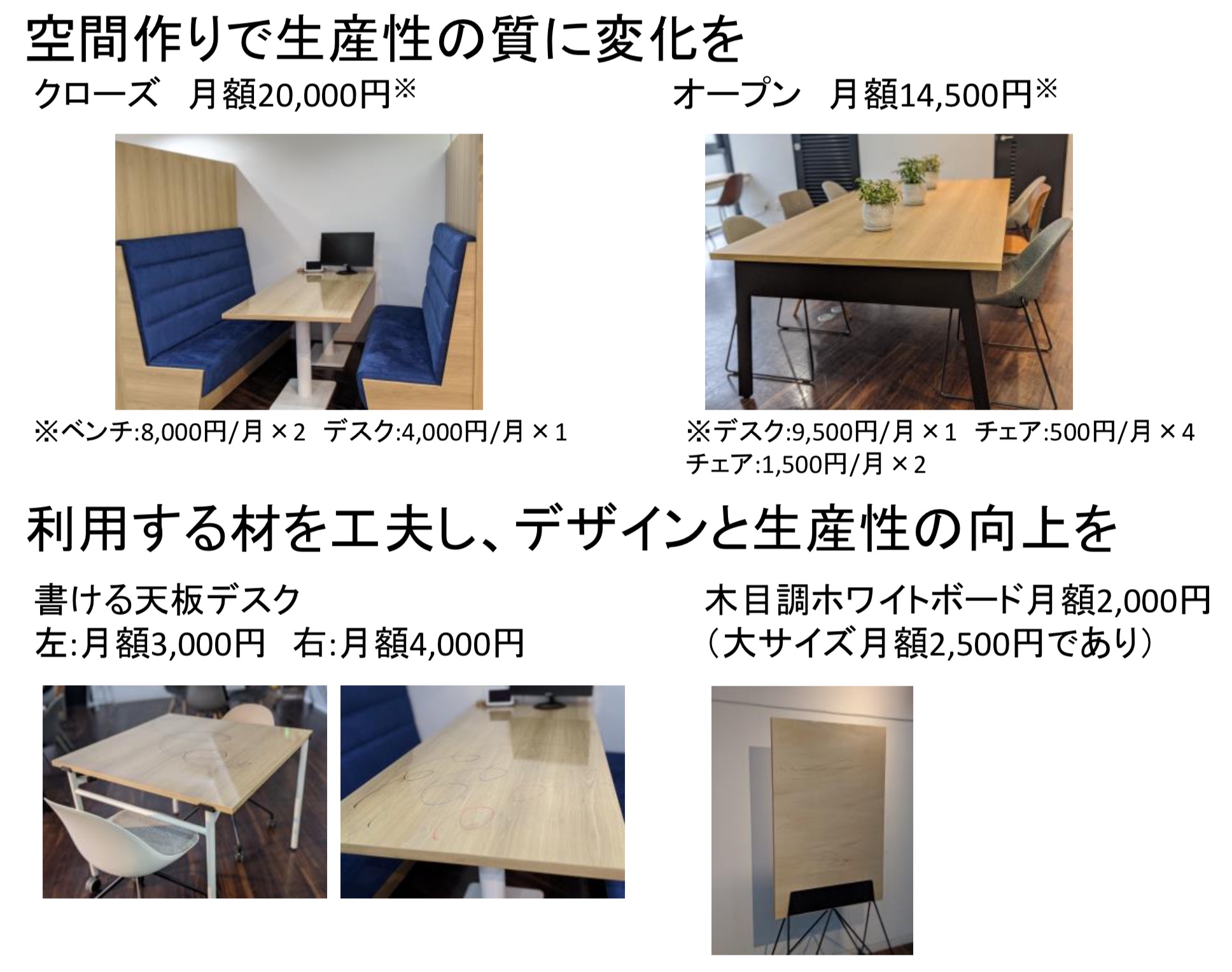 また交換し放題であるため“A/Bテスト”のような感覚で何度も家具やレイアウトを変更でき、理想のオフィスづくりに強いこだわりがある企業とも相性が良さそうだ。