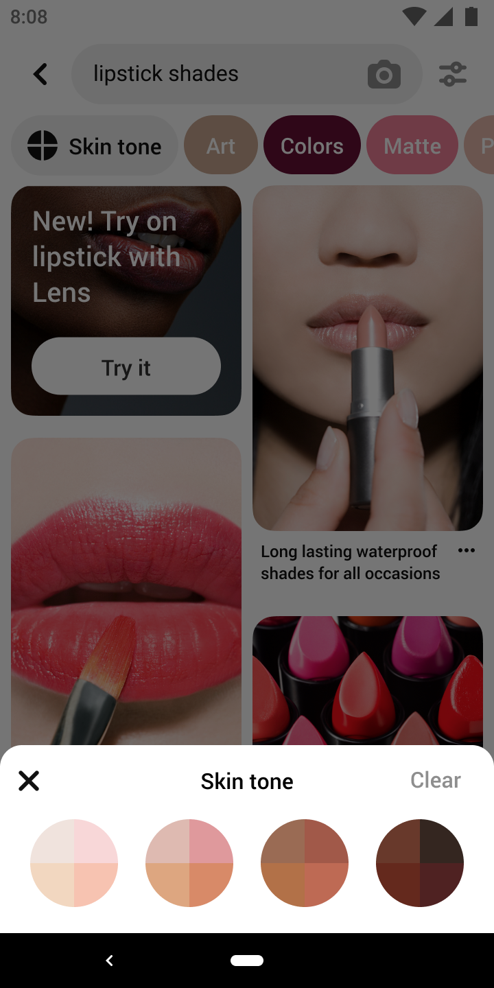 Pinterestによれば、この機能に使う写真には美肌などの効果は適用されないため、実際の自分にリップが似合うかどうかを試せるという。さらにこの機能は肌の色の選択機能と統合されているため、ユーザーは自分の肌の色に合うリップを購入できる。