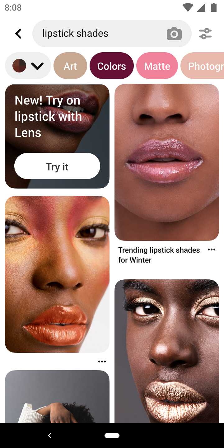 Pinterestの検索エンジンに「マット・リップスティック」や「レッド・リップ」など、リップに関連する語を入力して、この機能を利用することもできる。