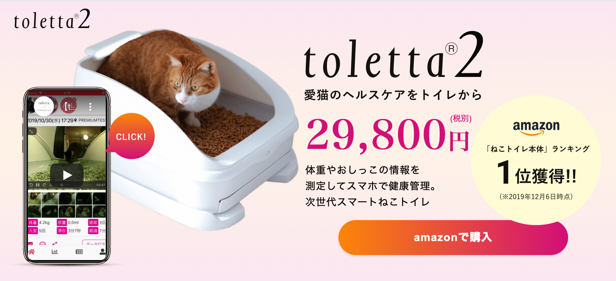 tolettaは、猫がトイレに入ってから用を足して出るまでを動画で撮影しつつ、体重や尿量、尿回数、滞在時間などを自動的に記録できるIoT猫トイレ。動画で猫の様子を観察できるほか、体重減少はトイレの頻度などを参照できるので、飼い主が猫の状態変化を常に把握できる。同社ではこれまで約2000頭の猫の約100万件のデータを保有している。tolettaの本体価格は3万2780円でAmazonなどで入手可能。利用するには家庭内に2.4GHzのWi-Fi環境が必要だ。