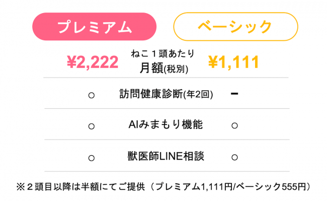 2頭目以降は月額料金が半額。サブスクリプションサービスには、年2回の訪問健康診断がない月額1111円のベーシックプランもある。なお、今回のサービス開始に伴い、これまで無料で提供していた獣医師への相談サービスは終了となるが、有料プラン申し込みへの相談などについて無料カウンセリングが受けられる。具体的には、高齢や既往歴のある猫でも必要な検査が受けられるかなどを、当院獣医師に相談できる。