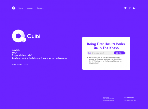 2020年4月6日リリース予定。サブスク型で、広告付きは月額$5、広告なしだと月額$8。クリスシー・テイゲン、スティーブン・スピルバーグ、ジェニファー・ロペスなどと一緒にコンテンツ制作を発表。さらにP&Gなど大手との広告案件も獲得済み。