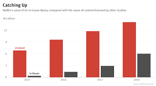 実際にNetflixで人気のコンテンツ「The Office」や「フレンズ」は、他社から独占契約されてしまった。そうなるとオリジナル番組を作らなくてはならない。オリジナルコンテンツへ投資を過去からしているおかげで、昔だと圧倒的に外部IPに頼ってたのが、NetflixオリジナルIPの価値が4年ほどでほぼゼロから$6Bまで上がった。