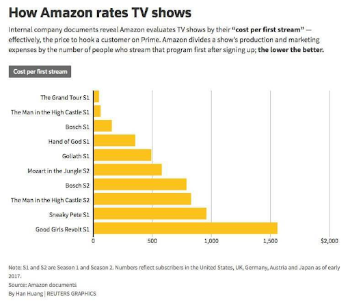 Amazon Prime Videoはコンテンツを利用したユーザー獲得の戦略でしかない。Amazon社内で計算した結果、Amazonのヒット作品The Man in the High CastleのPrimeへの新規ユーザー獲得コストは一人当たり63ドル。Amazon Prime自体は毎年99ドルかかるので、それだけでも良いCACだと思う。