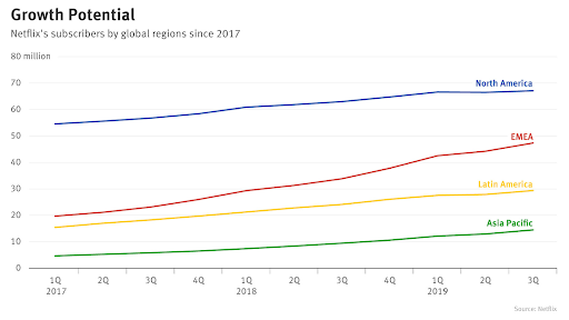Netflixのユーザー成長率はかなり株価を影響しているが、アメリカではここ最近は伸びていない。2019年は一時期ユーザー数がアメリカで減ったせいで、株価がかなり下がった時期もあった。その主な理由は競合が増えていること、Netflixが保有していた外部ライセンス(人気IPのFriends、The Office)などが別のストリーミングサービスと独占契約していること、オリジナル番組で大ヒットしているコンテンツが少ないからだと思われる。