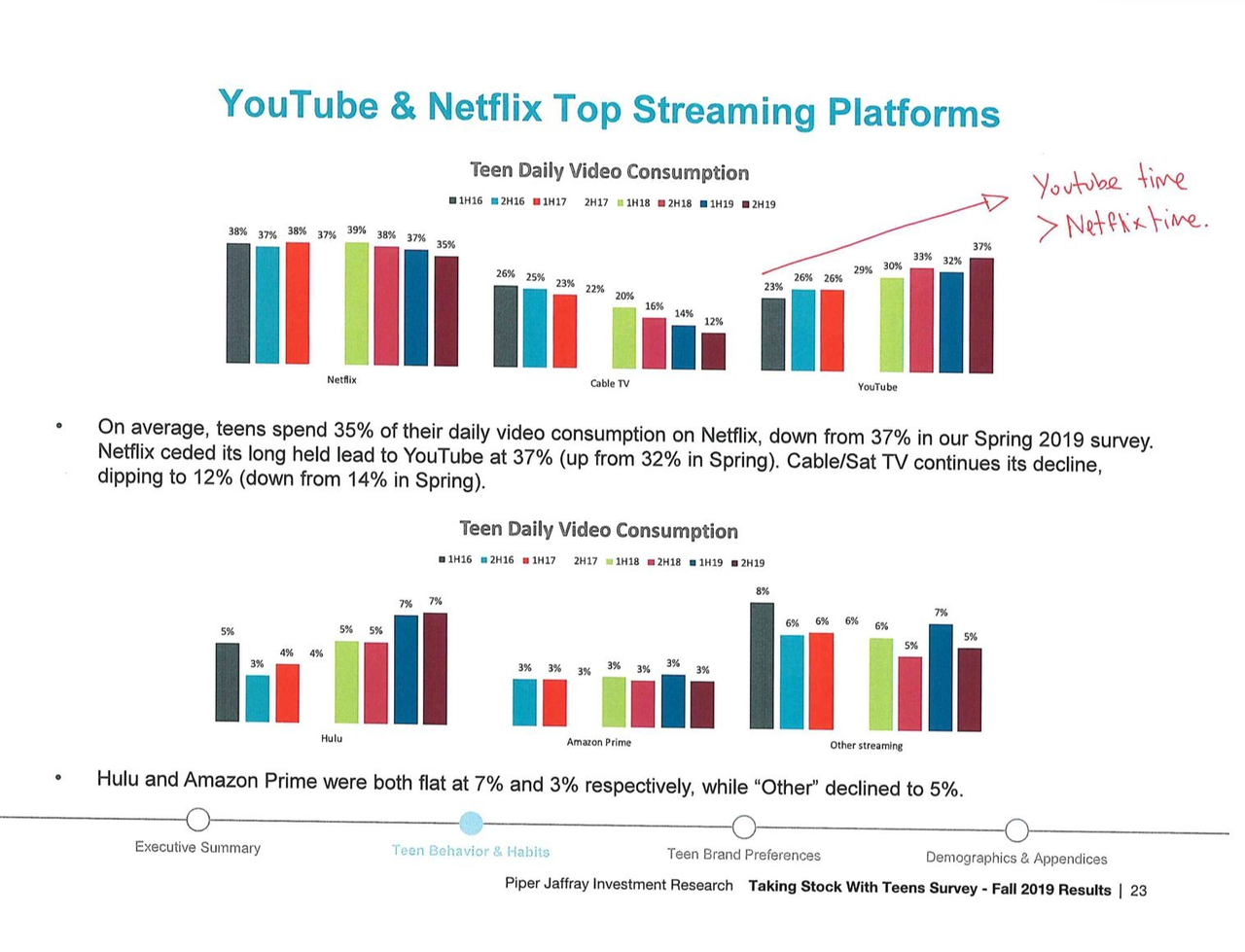 YouTube TVが出た影響でGen Zの中で初めてYouTubeがNetflixよりもストリーミングで人気になったが、それでもかなり若者層には人気だ。ただ、2018年から少しずつだがNetflixでの視聴時間割合が徐々に減っているのだ。
