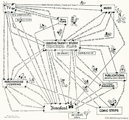 このクロスプロモーション戦略は、最近のDisneyが考えているものではなく、創業者のウォルト・ディズニー氏本人も考えていたことだった。最初のテーマパークが作られた1年後に描かれた戦略の中心にはコンテンツスタジオがあり、テレビや音楽、漫画、雑誌などに繋がり、そこから全てのビジネスがマーチャンダイズ事業とテーマパーク事業に繋がっていくと50年前以上前から生み出していた。