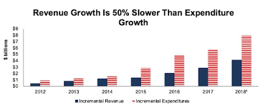 これだけオリジナルコンテンツに投資しても、新規登録ユーザー数が足らないと以前取締役会で説明したNetflix。今の売上とコストを見ると、圧倒的にコストの上がっているスピードが高い。