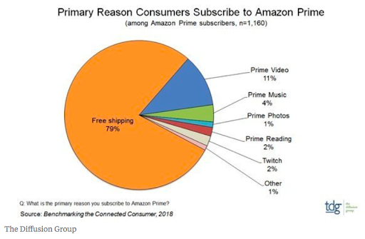 AmazonはわざとAmazon Prime VideoをAmazon Primeより高い値段にしている。なぜなら、少しでもAmazon Primeへ入ってくれる理由を上げるためであれば、コンテンツを無料で配信してもROIが十分だと計算しているからだ。実際に2018年の調査を見ると、11%はAmazon Primeに入った一番の理由はPrime Video。