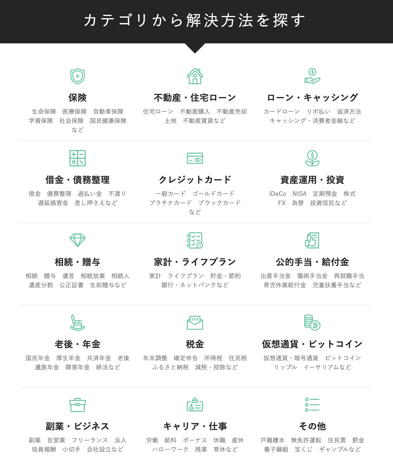 2018年9月に正式リリースされたおかねアンサーは、一般消費者がお金に関する悩みを専門家に相談できるサービスだ。お金の管理や資産運用・投資、保険や税金、年金、相続、暗号資産など、多様なカテゴリについて、無料で質問を受け付けている。また他の人の質問と専門家の回答を閲覧して、参考にすることもできる。