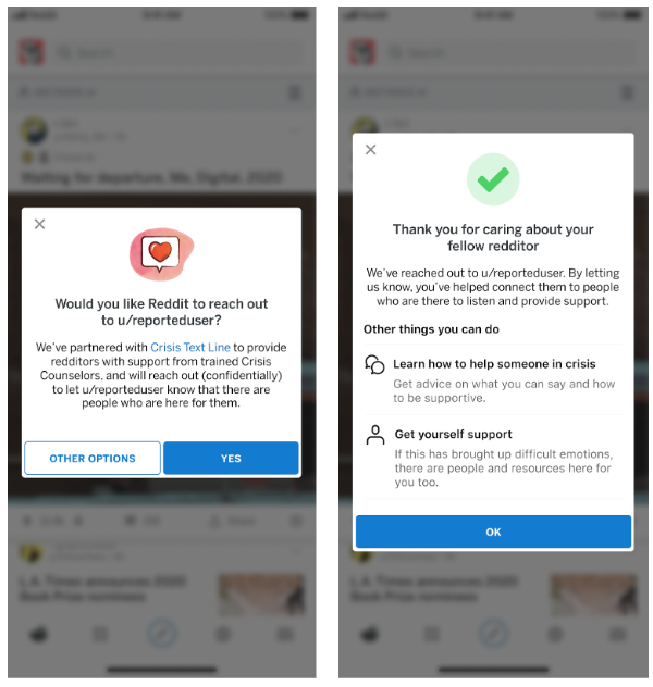 意見を交わすためのウェブサイトで、何千ものコミュニティを擁するRedditは今週、メンタルヘルスサービスのCrisis Text Lineと新たに提携したことを発表した。Crisis Text Lineは自殺を考えている人や自傷する人など、精神的に追い詰められている人を年中いつでもサポートするメンタルヘルスのためのテキストラインだ。今回の提携で、Redditユーザーは誰かの投稿に悩みや危機感がにじんでいるのに気づいたら、その人にフラグを立てることができる。するとフラグが立てられたユーザーにはリソースやカウンセラーにつながるヘルプラインを紹介するプライベートメッセージが送られる。