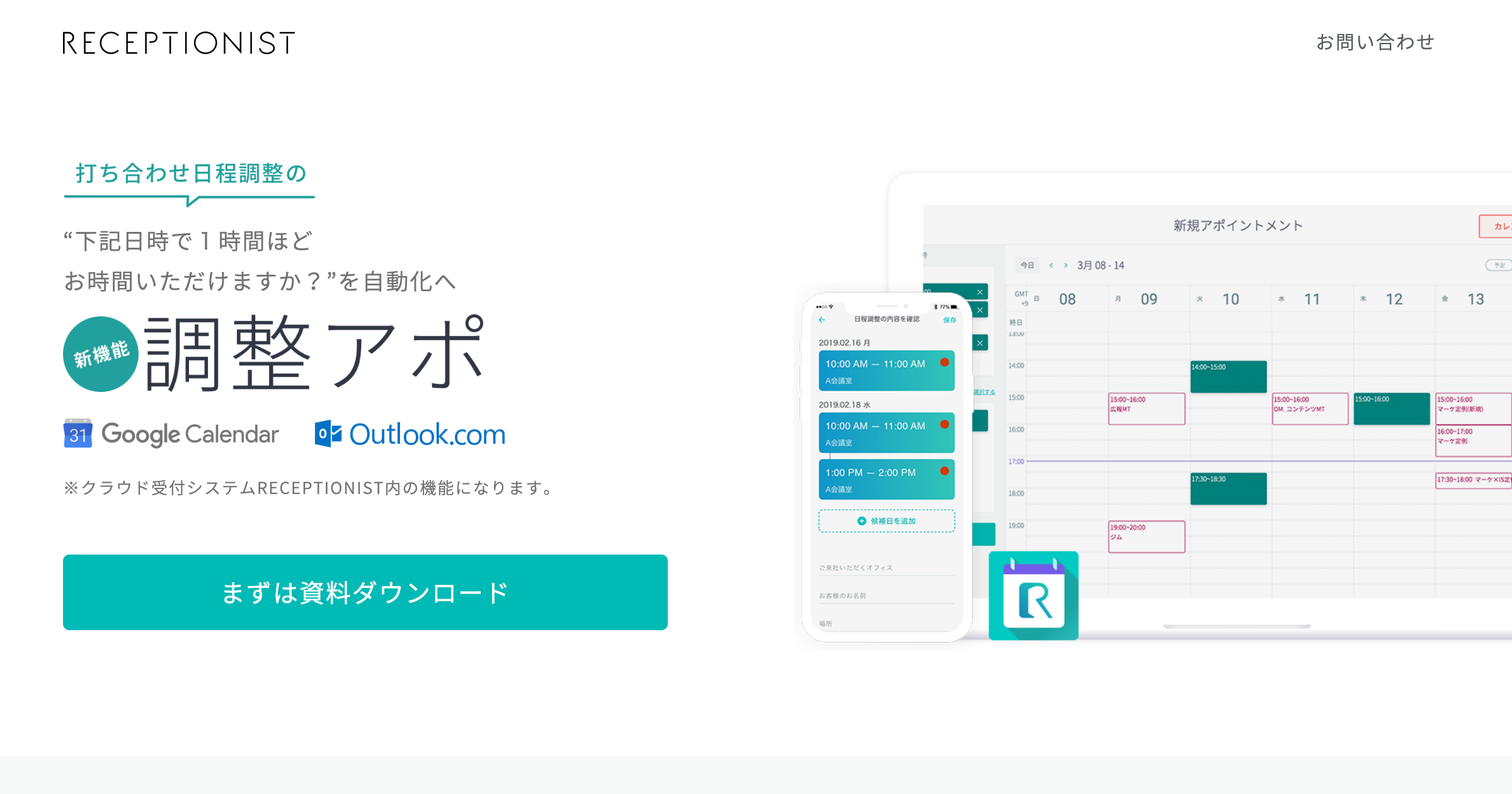 また2018年12月に搭載した新機能「調整アポ」を利用することで、来客受付だけでなく、日程調整の工程も約8割減らすことが可能となった。Google カレンダー、Outlook カレンダーと連携した調整アポにより、関係者・会議室の空き日時を仮押さえすると、来訪者にはURLが通知される。来訪者が、リンク先の候補から都合の良い日時を選択すると予定が確定し、それ以外の仮予定は自動でキャンセル。予定確定後、来訪者には受付コードが自動で送られ、受付時の名前や社名の入力も不要だ。