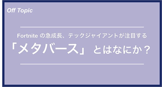 今回は、ユーザーのアテンション(注目)を奪い合う戦いになっている今、フォートナイトがなぜこれほど支持されているのか、「メタバース」とはなにか紹介したいと思う。メタバースを知ることによって、FacebookがOculusを買収した意図、マイクロソフトが今まで以上にコンシューマーサービスに注力しているかなど理解できるだろう。