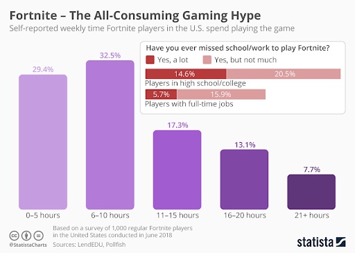 20%以上のユーザーが1週間のうち16時間以上プレイし、35%以上のユーザーがフォートナイトが原因で学校の授業をサボったことがあると言われている。Off Topicのポッドキャスト(#19 Fortniteの大ヒットからみる次世代ゲーム事情)でも話があったが、人気になりすぎてフォートナイト中毒から抜け出すセラピーキャンプに子供を通わせる親もいるほどだ。