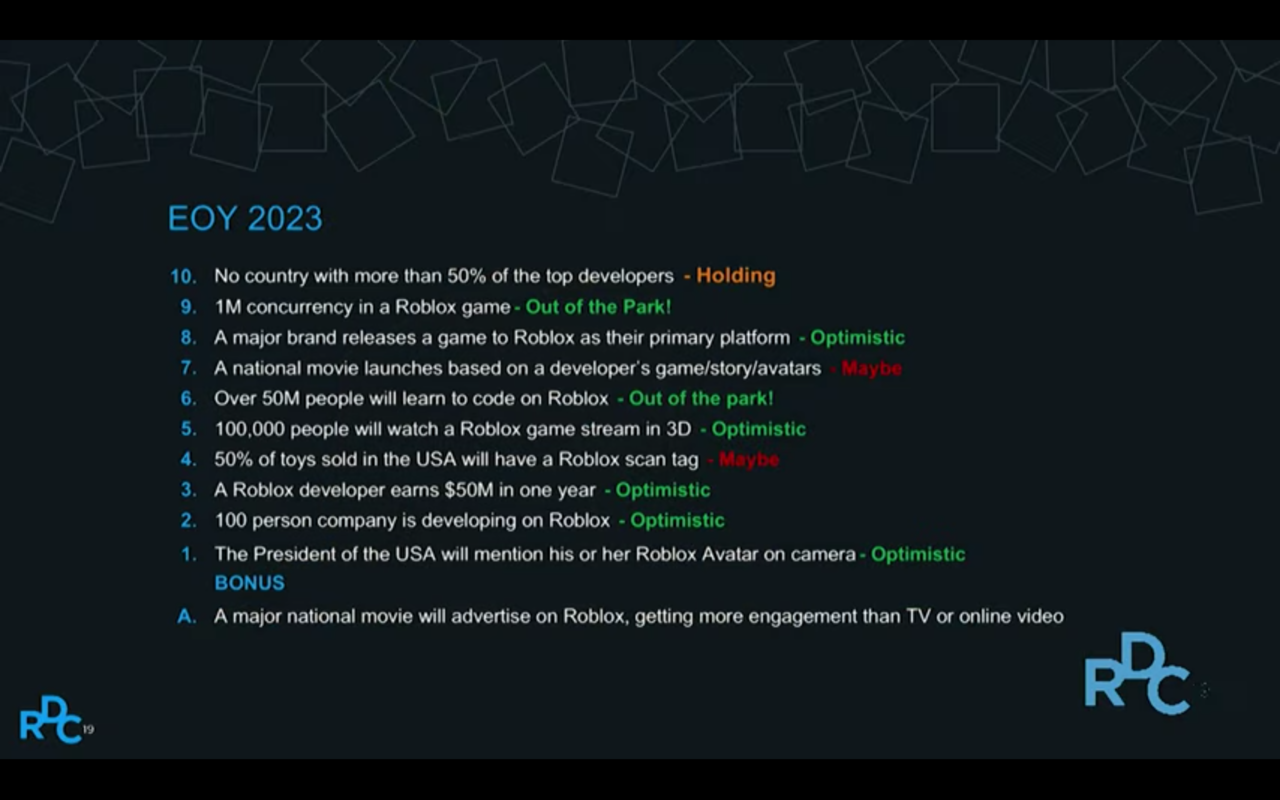 そんなRoblox CEOが持っているも2023年までの目標がこれだ。以下はRobloxのKeynoteだ。