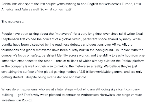 そして先日、Andreessen Horowitzがリードインベスターとして$150M調達したことを発表。まだRobloxが買収されてないことが少し不思議に感じる。。