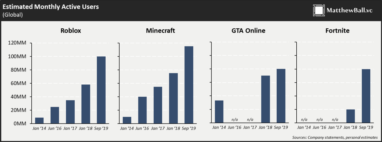 エピックゲームズに一番近しいゲームはマインクラフトとRoblox(ロブロックス)。Robloxはゲーム制作プラットフォームであり、Roblox上で他の人が作ったゲームをプレイできるレゴやマインクラフト的なゲーム。Robloxはかなり面白い立ち位置にいて、著者はGoogleなどが買収するのではないかと思っている(特にGoogleはStadiaを開始したばかりなので)。圧倒的にメディアに取り上げられることはフォートナイトやマインクラフトより少ないが、実際はフォートナイトよりMAUが多く、マインクラフトに追いついている超人気ゲーム。去年の1月時点で月間10億時間プレイされる驚異的ゲーム。