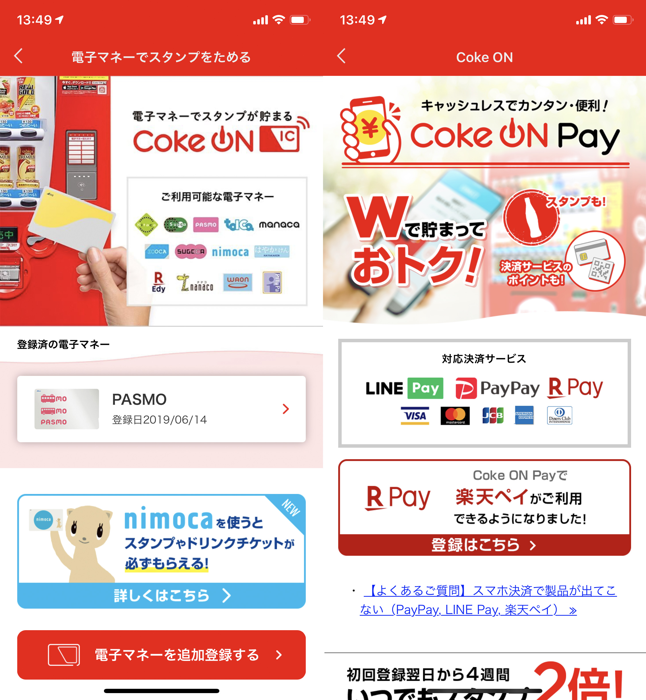 コカコーラでは、スマートフォンアプリの「Coke On」とCoke On Pay対応自販機でのキャッシュレス決済も進めてきた。こちらは各種クレジットカード(VISA、Mastercard、JCB、 AMEX、ダイナースクラブ)、各種電子マネー(交通系、nanaco、WAON、Edy)、各種コード決済(PayPay、LINE Pay、楽天ペイ)をCoke Onアプリに事前登録しておけばキャッシュレス決済が可能だ。しかも商品を購入するたびにスタンプが1個以上付与され、スタンプが15個貯まると1本無料というサービスもある。一方で、アプリのダウンロードや支払い方法の事前設定、(一瞬で終わるが)Bluetoothによる自販機のペアリングなど一般ユーザーにとっては少しハードルが高いのが難点だった。