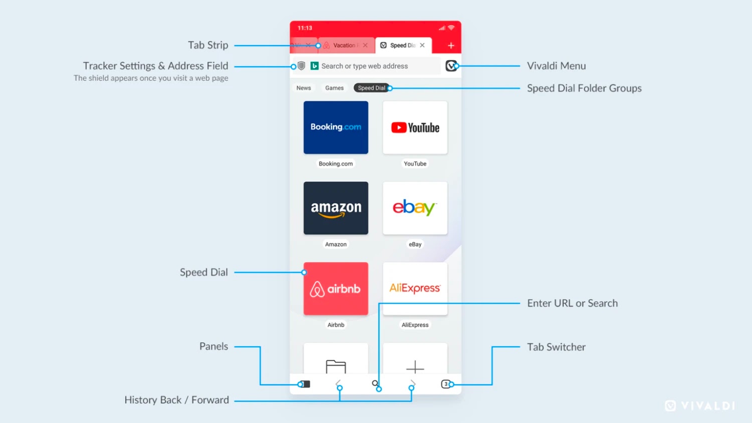 デスクトップ版と同様に、Android版Vivaldiにもトラッキングならびに広告のブロッカーが搭載されている。組み込みのスクリーンショットツールとVivaldiノートのサポートもあり、これらもデバイス間同期される。