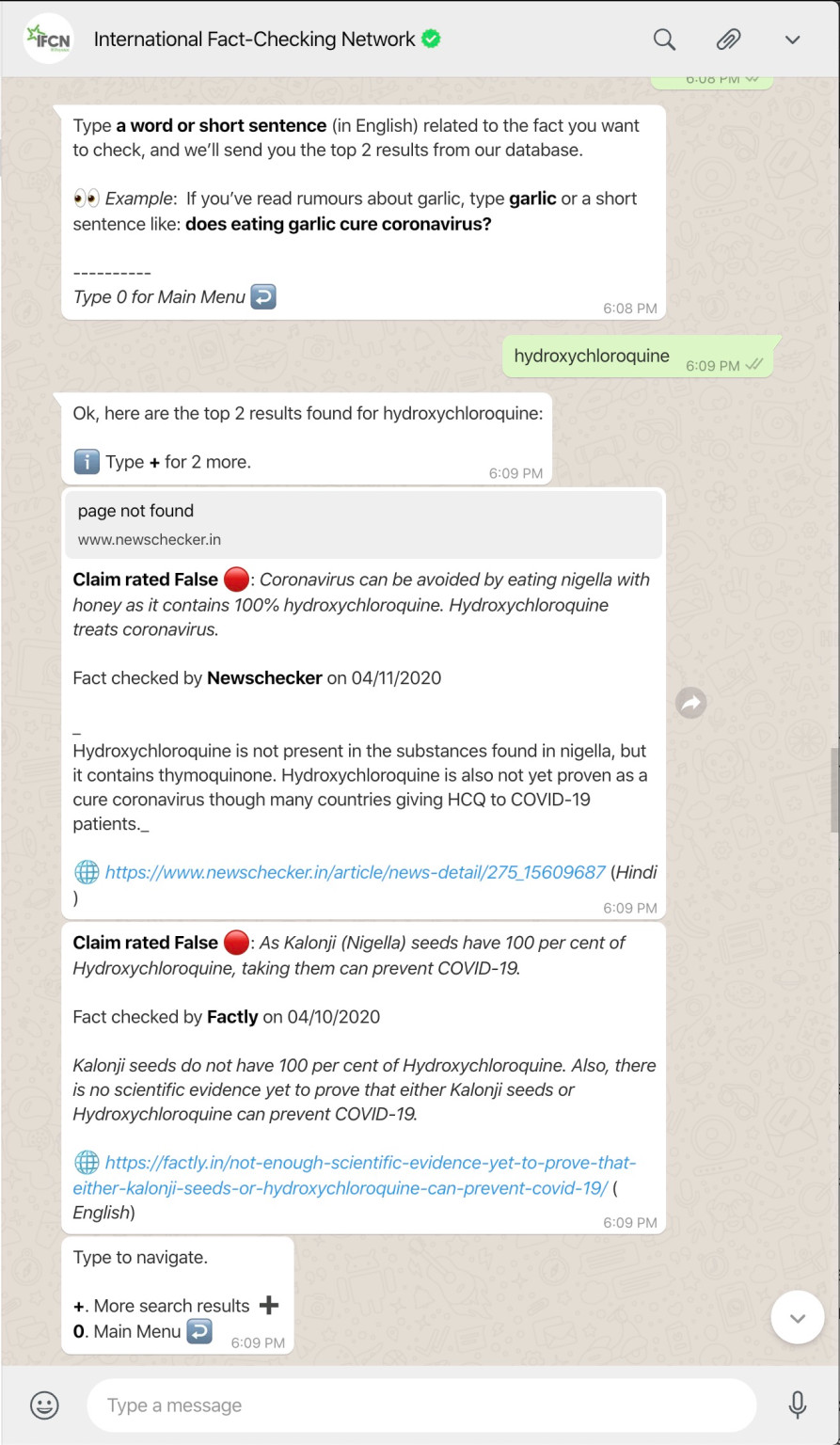 チャットボットは次の方法でテストできる。連絡先に「+1 (727) 2912606」を登録して、「hi」と送信する。または、チャットボットの電話番号を連絡先に登録したくない場合は、http://poy.nu/ifcnbotをクリックする。